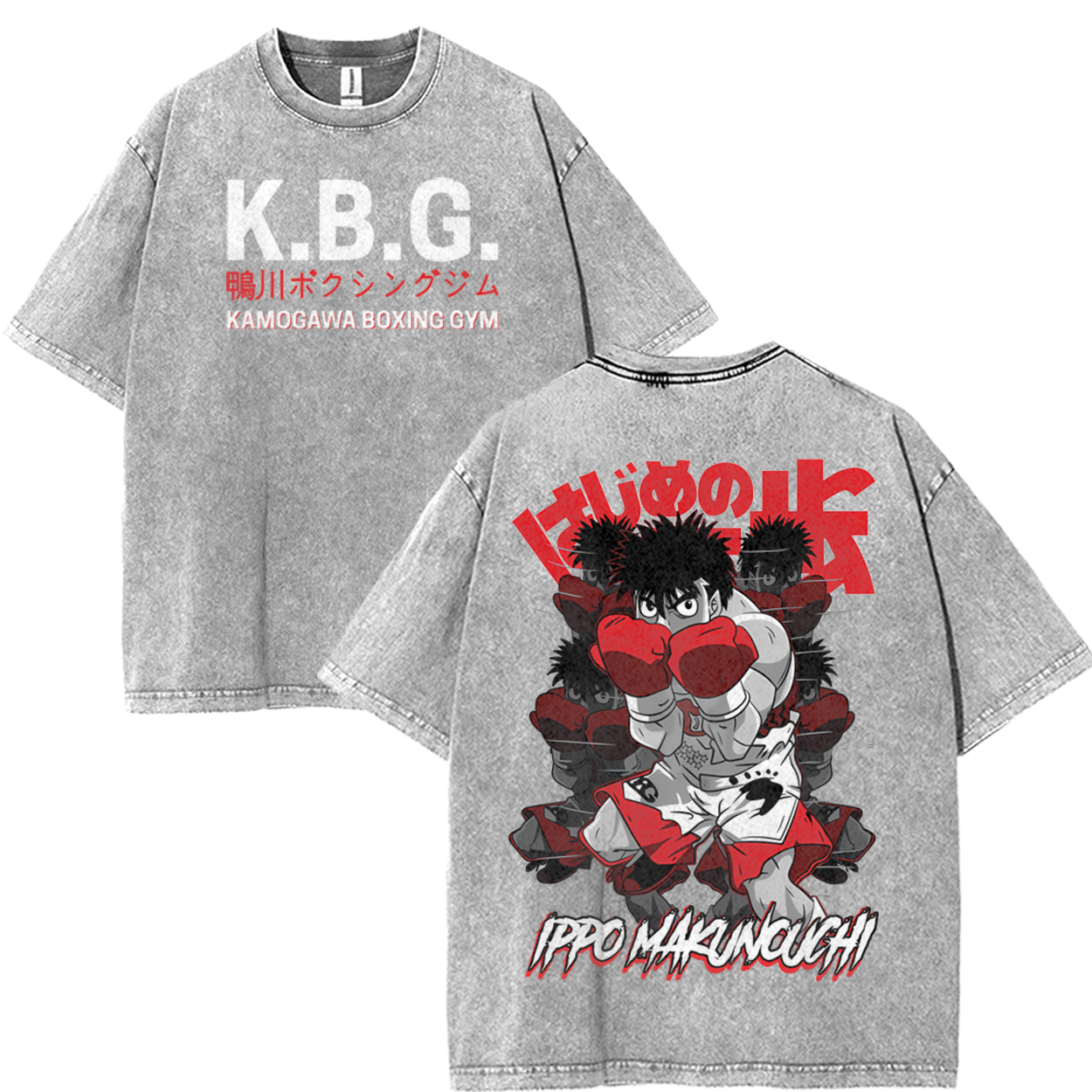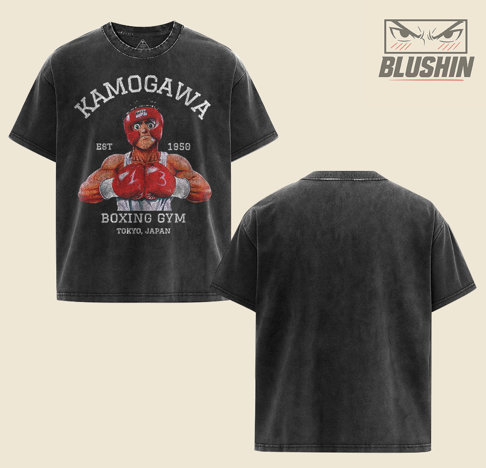 Hajime No Ippo Washed Tshirt, Kamogawa Boxing Gym Crew ippo Makunouchi Anime clothing Boxing Gloves Cotton Fabric graphic tees shirts Menswear Soft