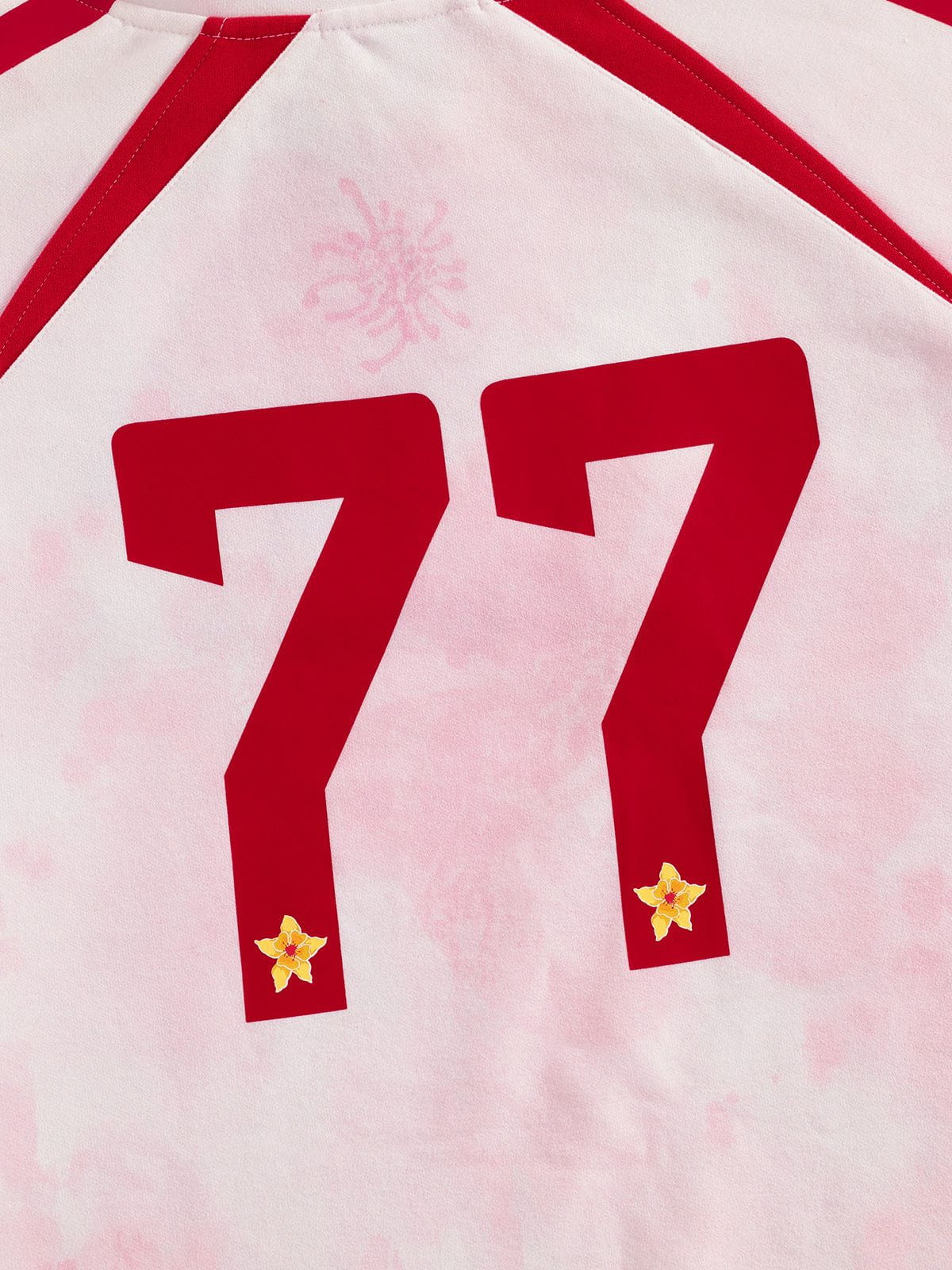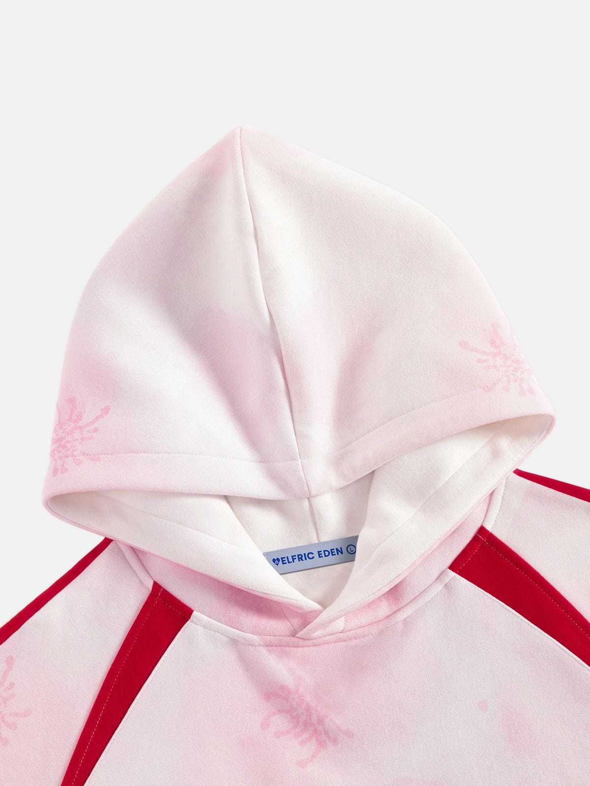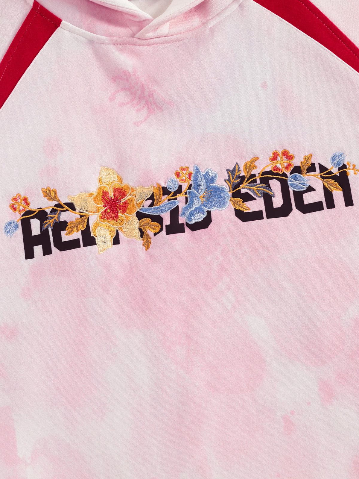 Crafted in soft cotton blend fabric, this hoodie features a unique color-block design accented with floral graphics, symbolizing vitality and renewal. The front is detailed with the Aelfric Eden logo surrounded by blossoms, while the back showcases a striking “77” graphic with star accents, evoking the spirit of a celestial jersey.