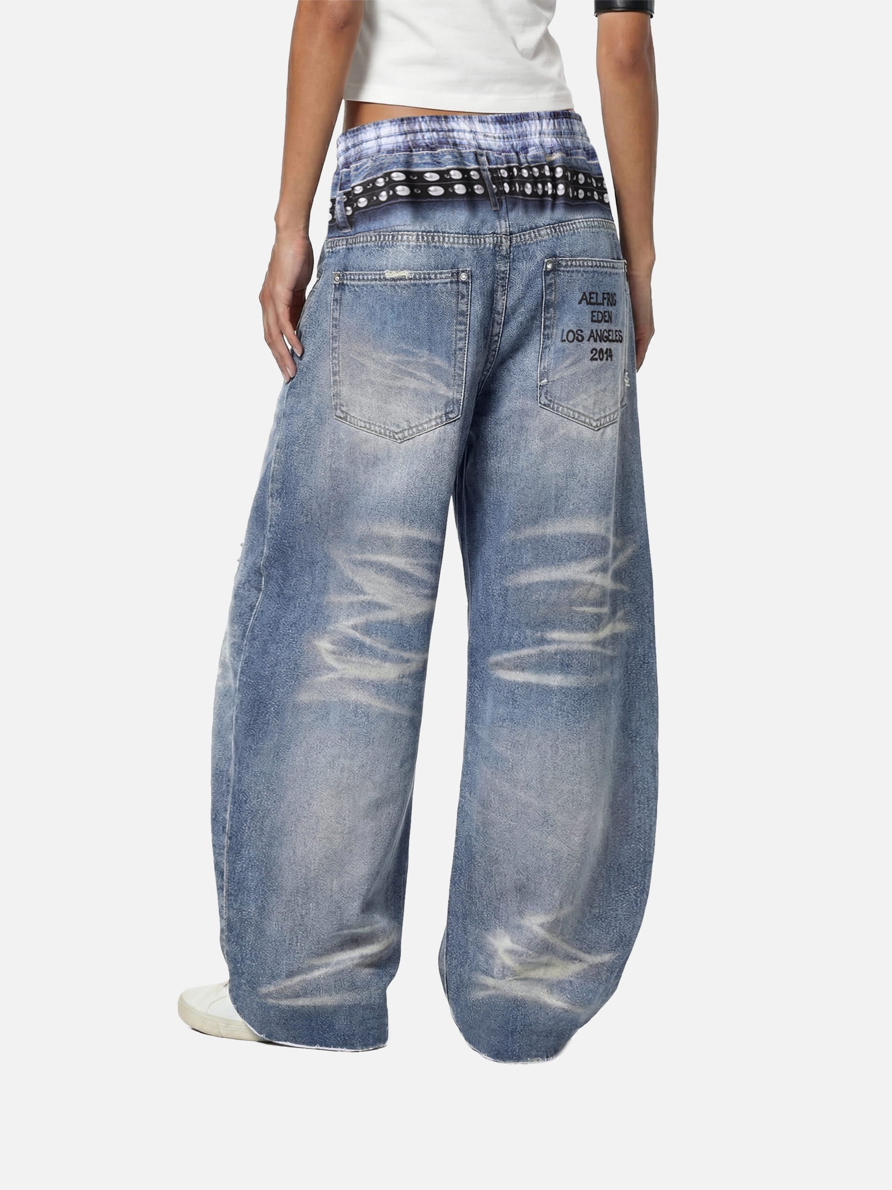 Baggy Barrel silhouette offers a relaxed, voluminous fit that drapes comfortably over the body. The wide-leg design creates a fluid silhouette, ideal for casual wear or layered looks. Structured with intentional distressing and a studded belt detail, it delivers a distinctive aesthetic that stands out in everyday settings.