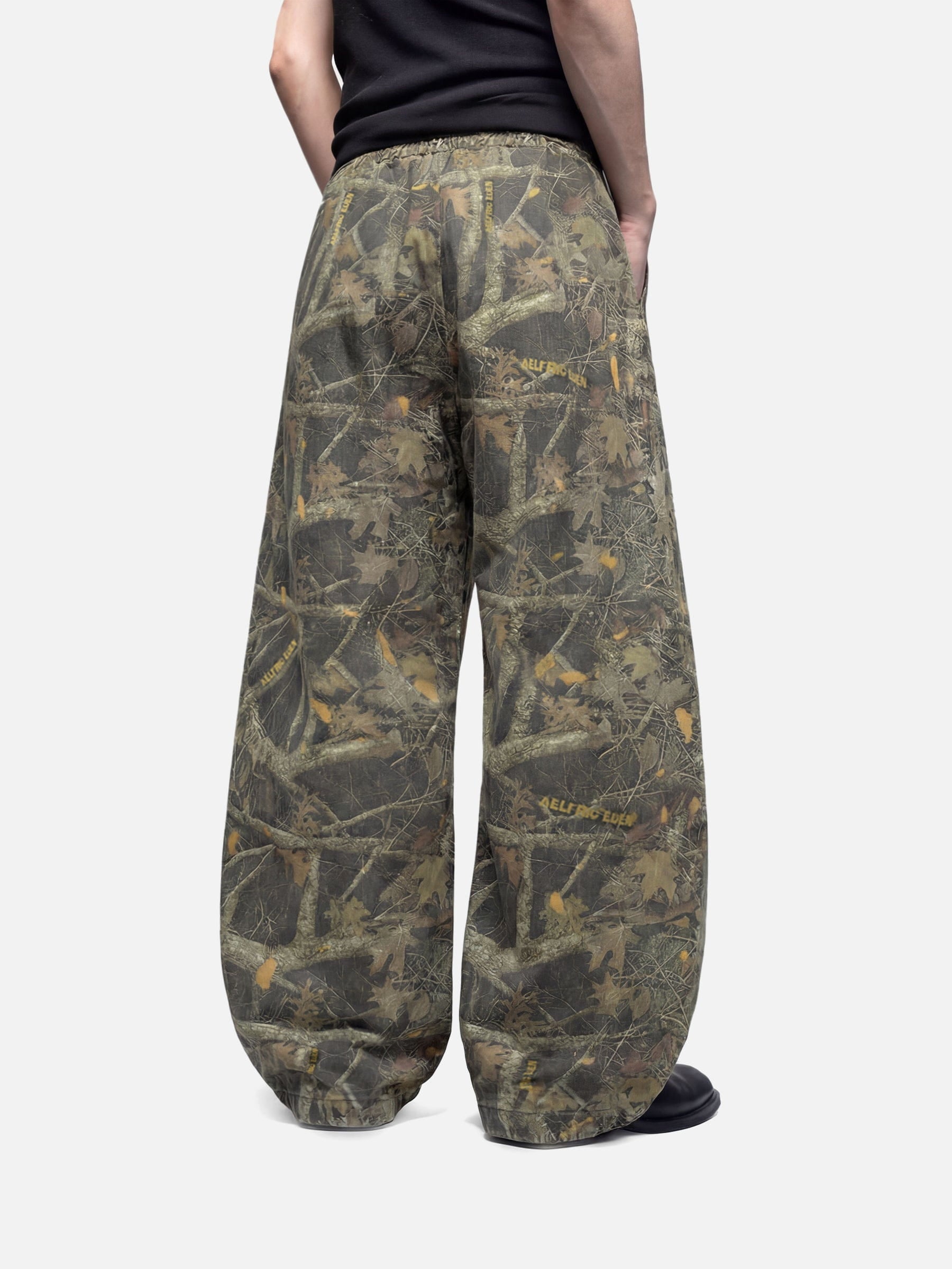 Built with a wide, curved leg form, these sweatpants reinterpret classic camouflage through an all-over woodland graphic. The bold surface pattern is balanced by a clean waistband and streamlined construction. Elastic finishes provide ease of wear while preserving the structured barrel shape.