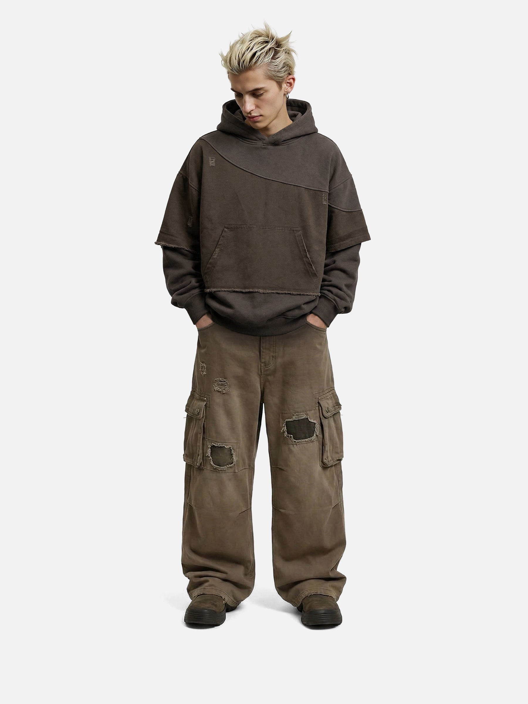 This oversized pullover hoodie features a panelled construction with visible seam lines across the body and sleeves. Distressed details and raw-edge finishes appear along select panels. It includes a centered kangaroo pocket, an attached hood, ribbed cuffs and hem, and a fleece-lined interior.