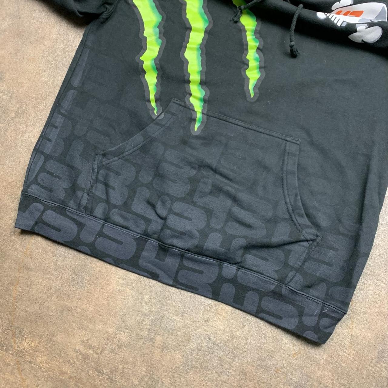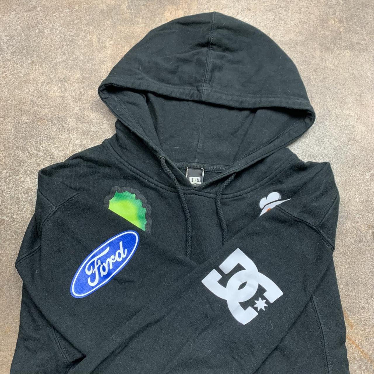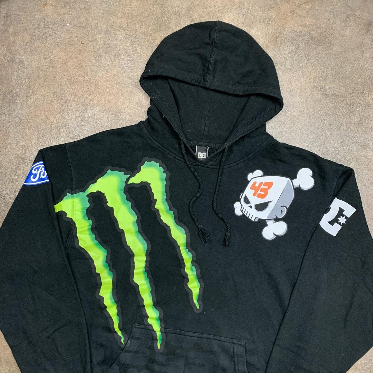 Crazy DC Shoes hoodie in collaboration with Monster & Ken Block featuring graphics all over with other brands featured including ford, firelli, alpinestars and more, faded grey 43 repeated graphic towards the bottom, coloured black all over & in excellent second hand condition with minimal wear.