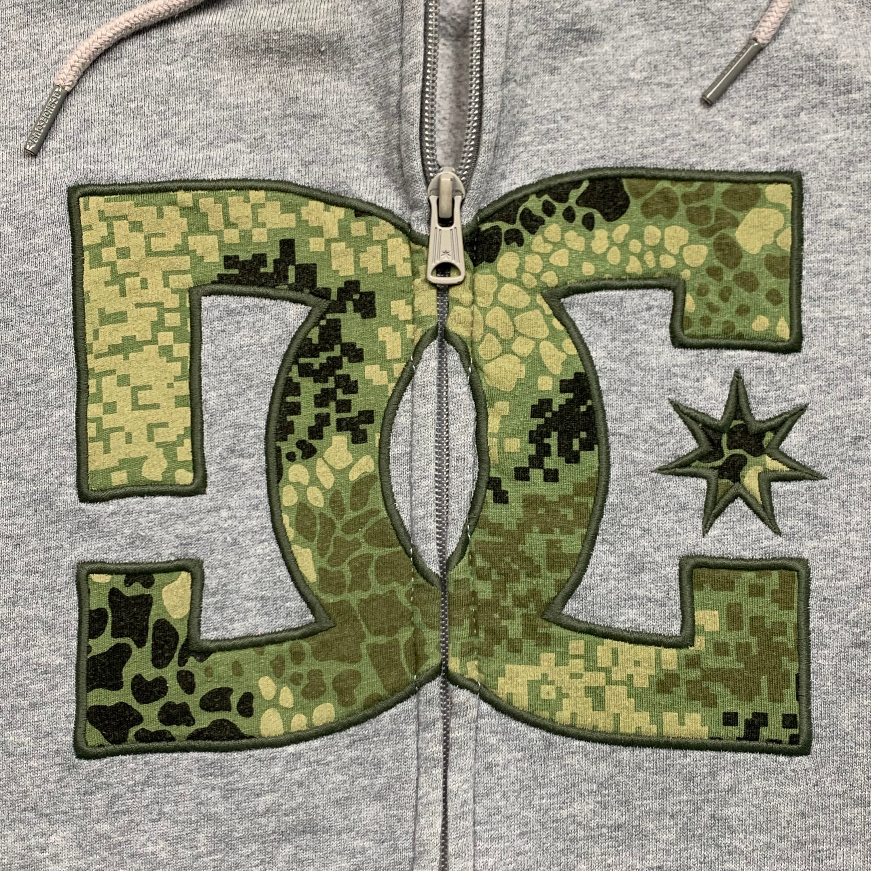 DPM DC hoodie with camo dpm patterns on the big star logo & hood lining, coloured grey all over & in good second hand condition with a repaired hole as shown.