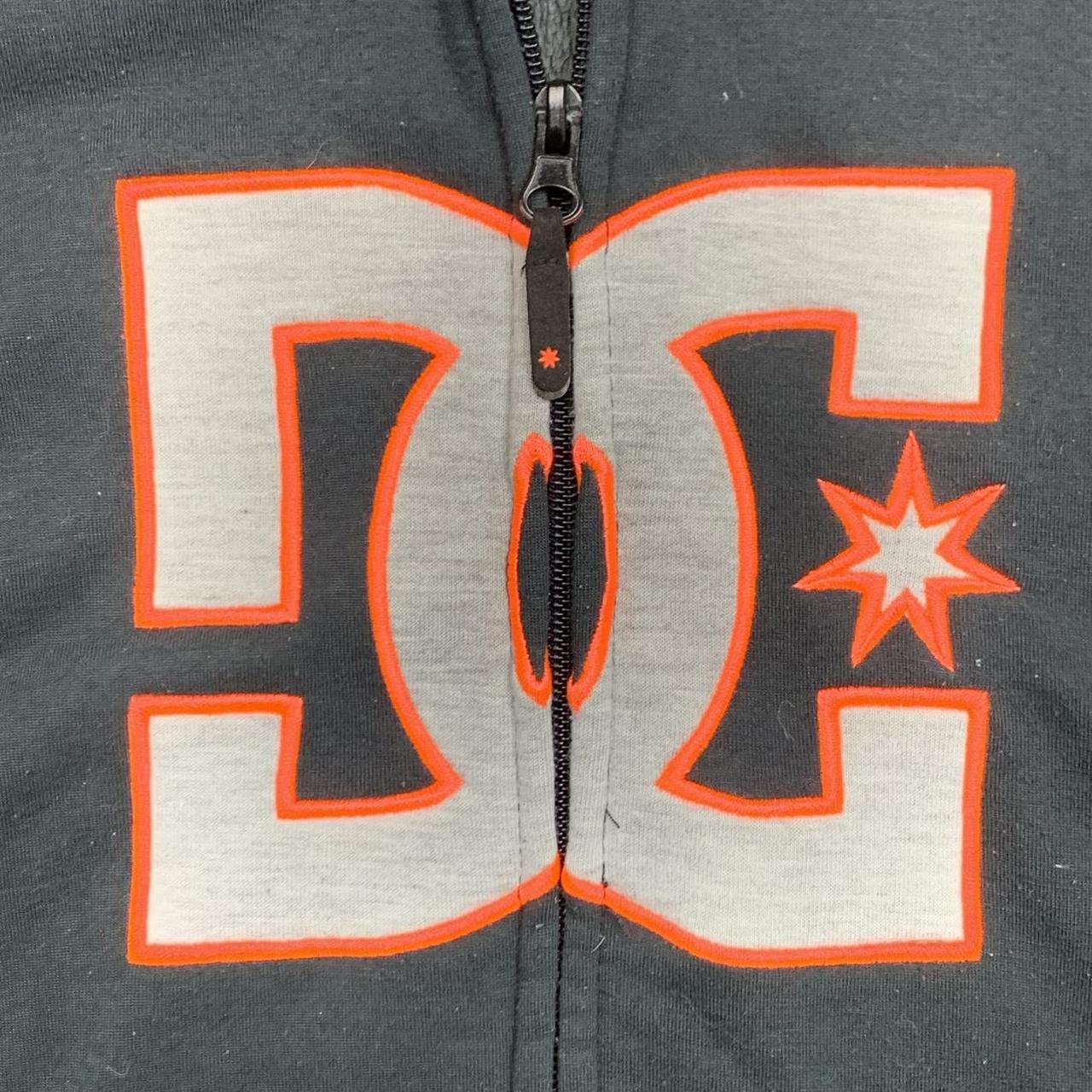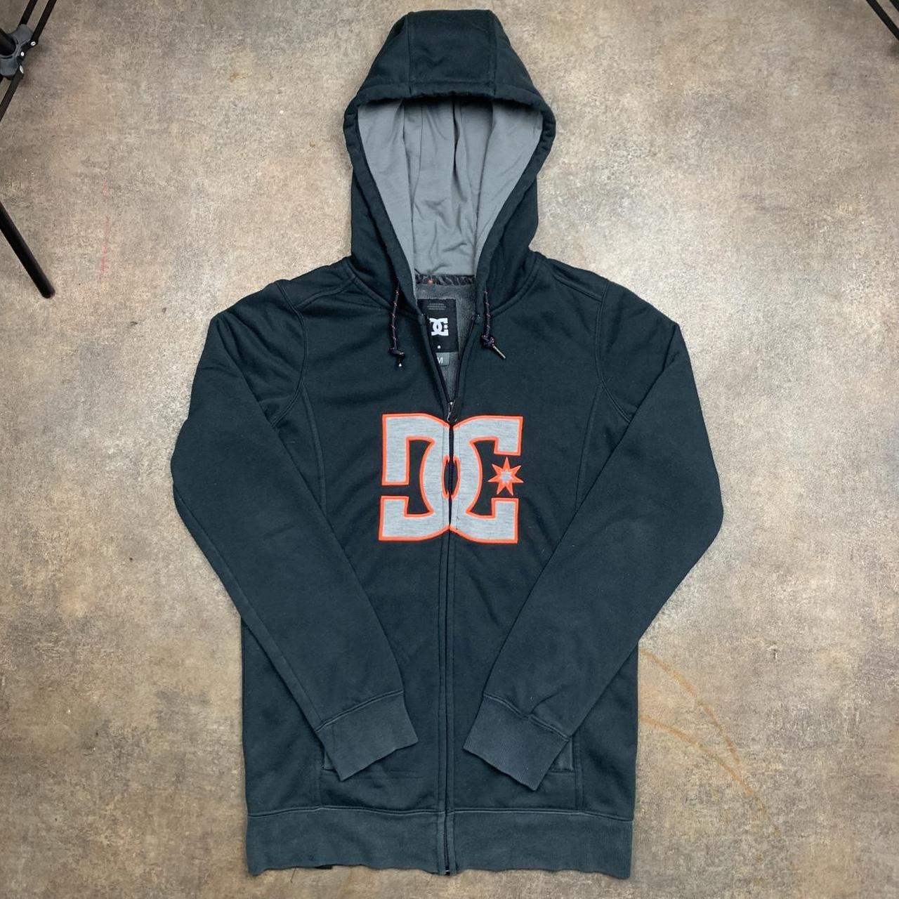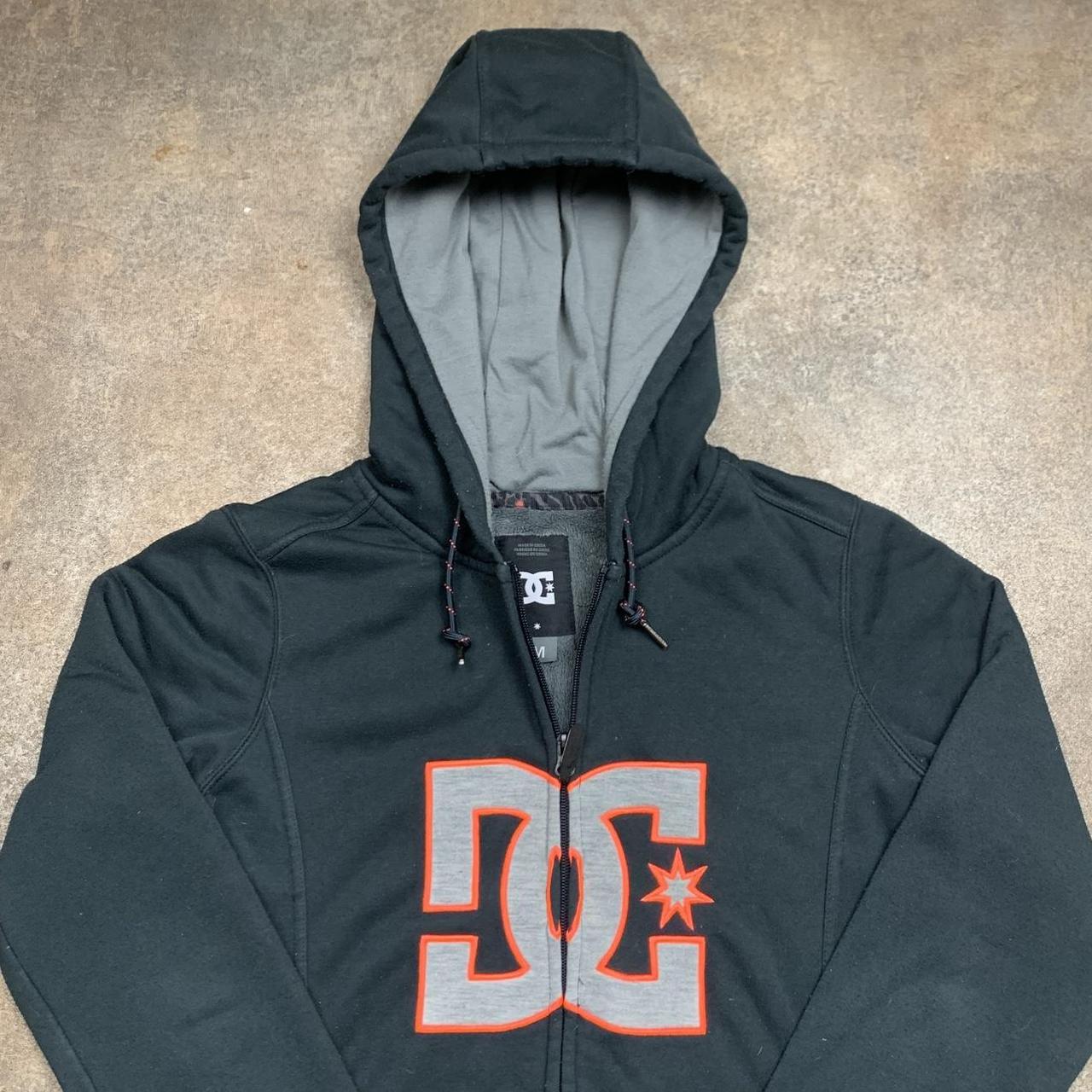 DC Shoes hoodie with a large grey/orange graphic across the front zip, brand detailing on the drawstring tips & the main zip, a branded tab on the back of the waistband, thumb holes in the sleeves, coloured black all over & in very good second hand condition with minimal wear.