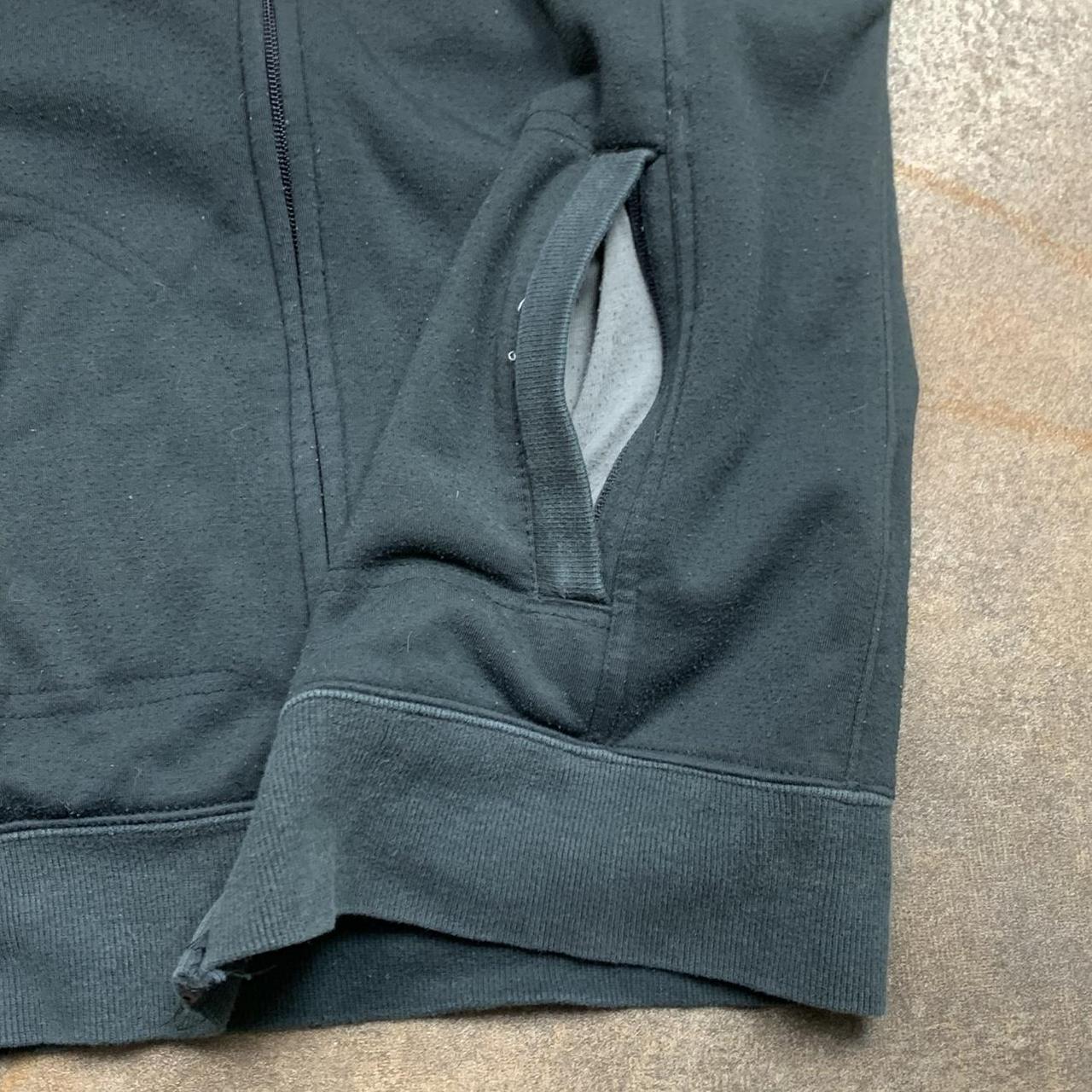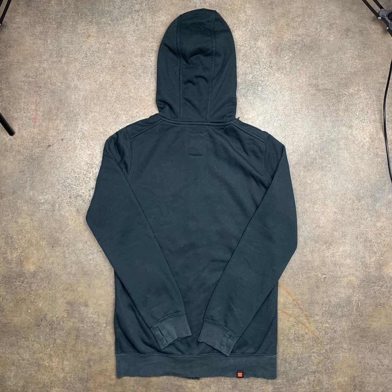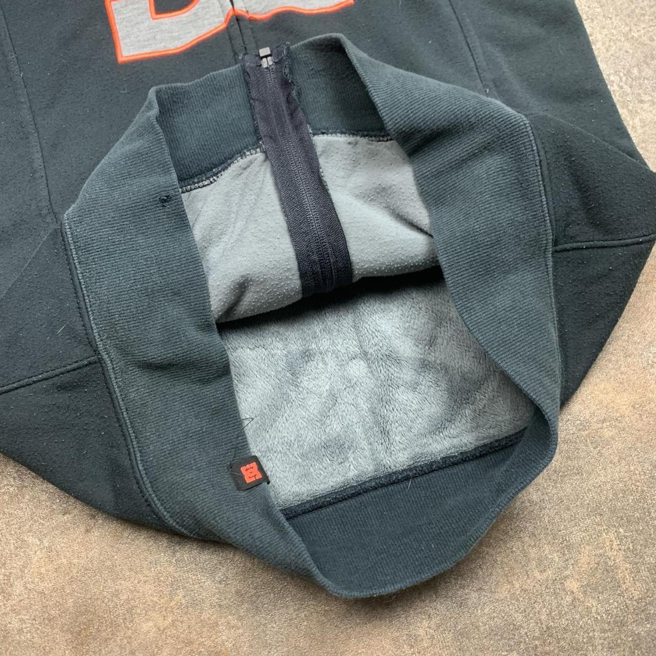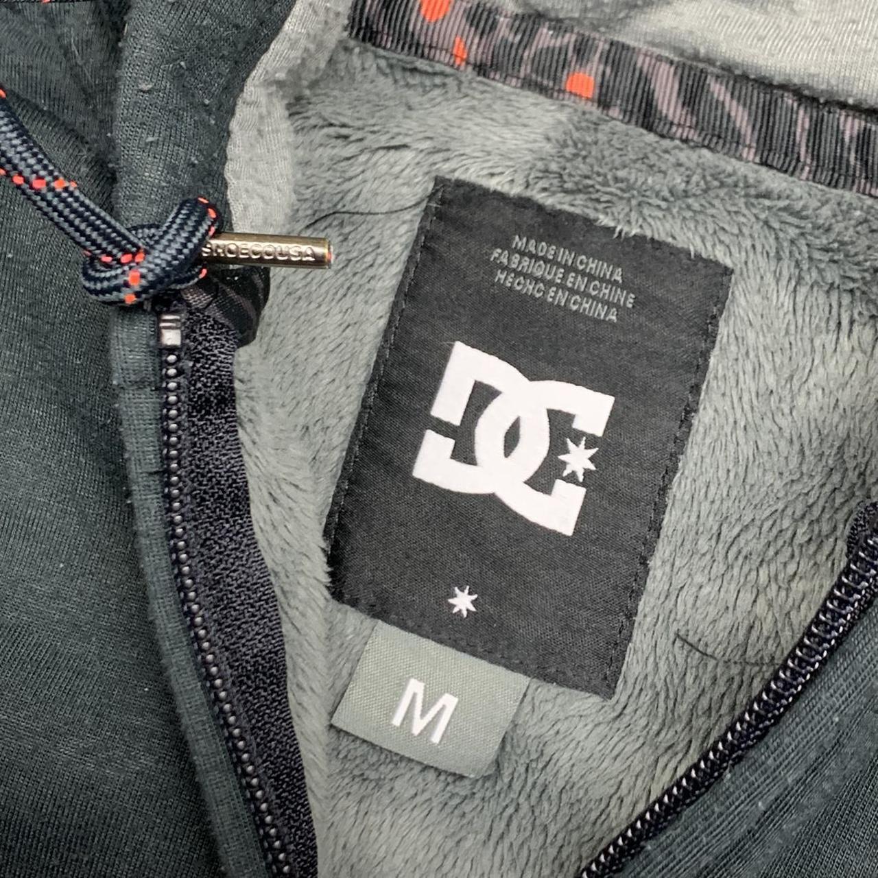 DC Shoes hoodie with a large grey/orange graphic across the front zip, brand detailing on the drawstring tips & the main zip, a branded tab on the back of the waistband, thumb holes in the sleeves, coloured black all over & in very good second hand condition with minimal wear.