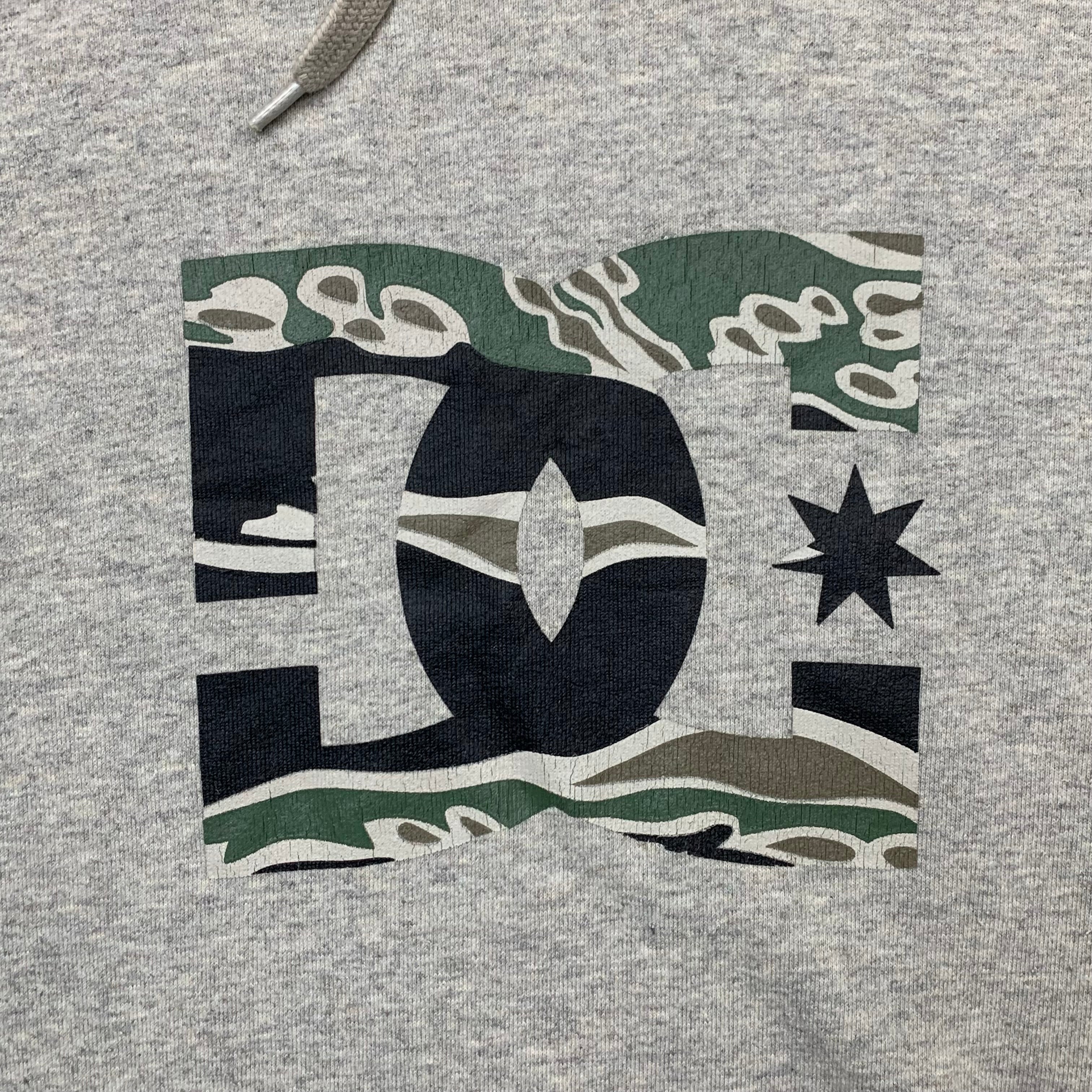 DC Shoes hoodie with a camo graphic big star logo on the front, coloured light grey all over, branded tab at the bottom of the back and in excellent second hand condition with minimal wear.