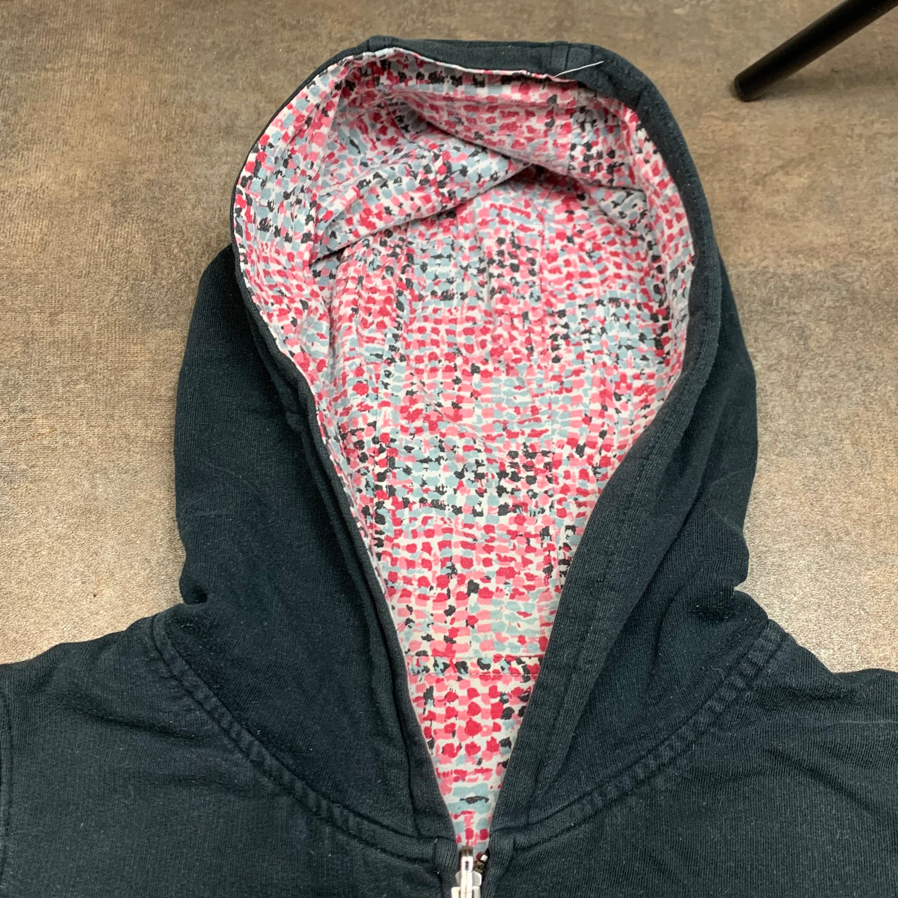 Vintage DC Shoes hoodie with a white/pink graphic big star logo on the black side & the same pattern repeated all over on the reverse side of the hoodie, a branded zip & in great second hand condition with rips to the cuffs as shown and note that the bottom of the zip track is warped but still works.