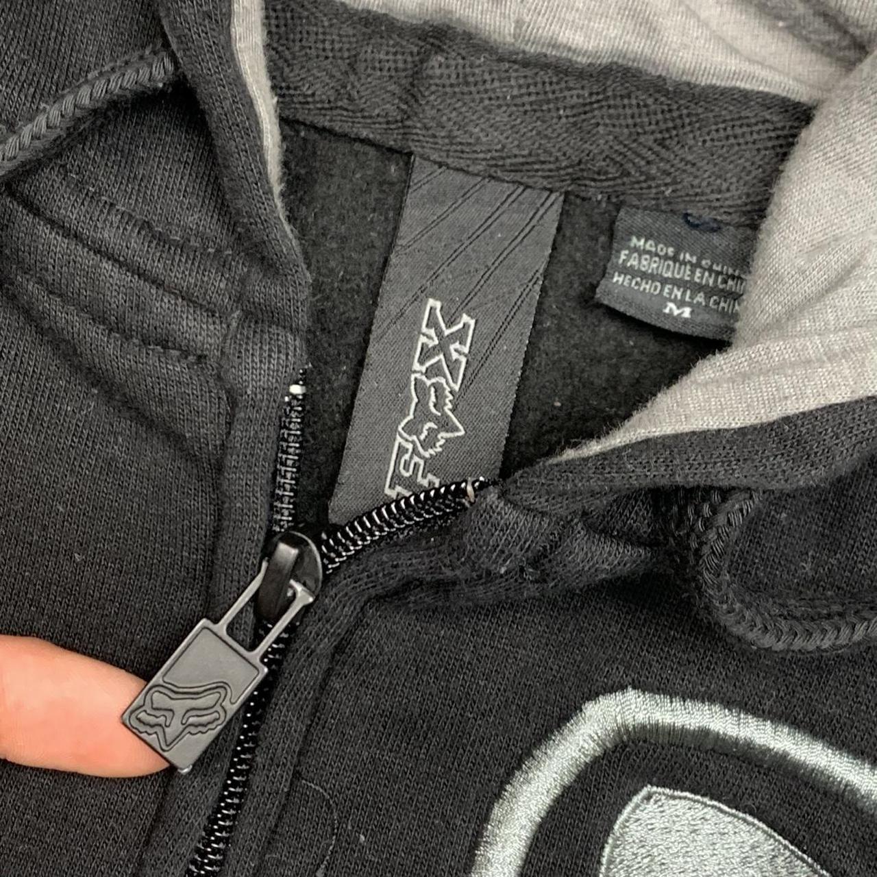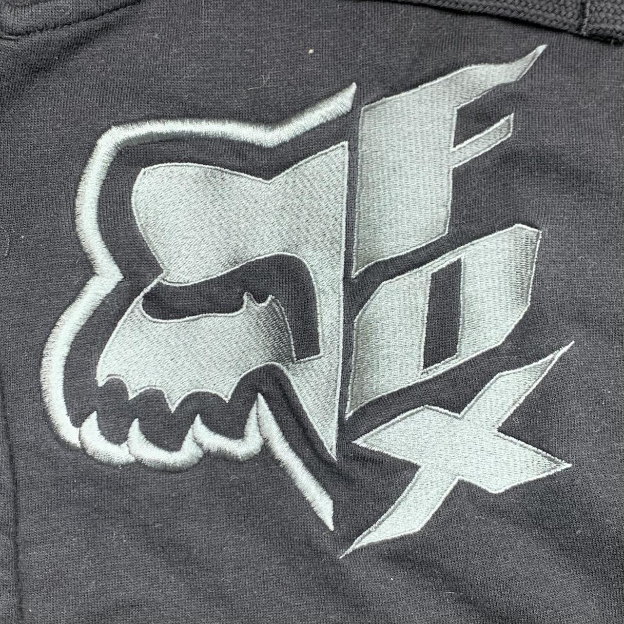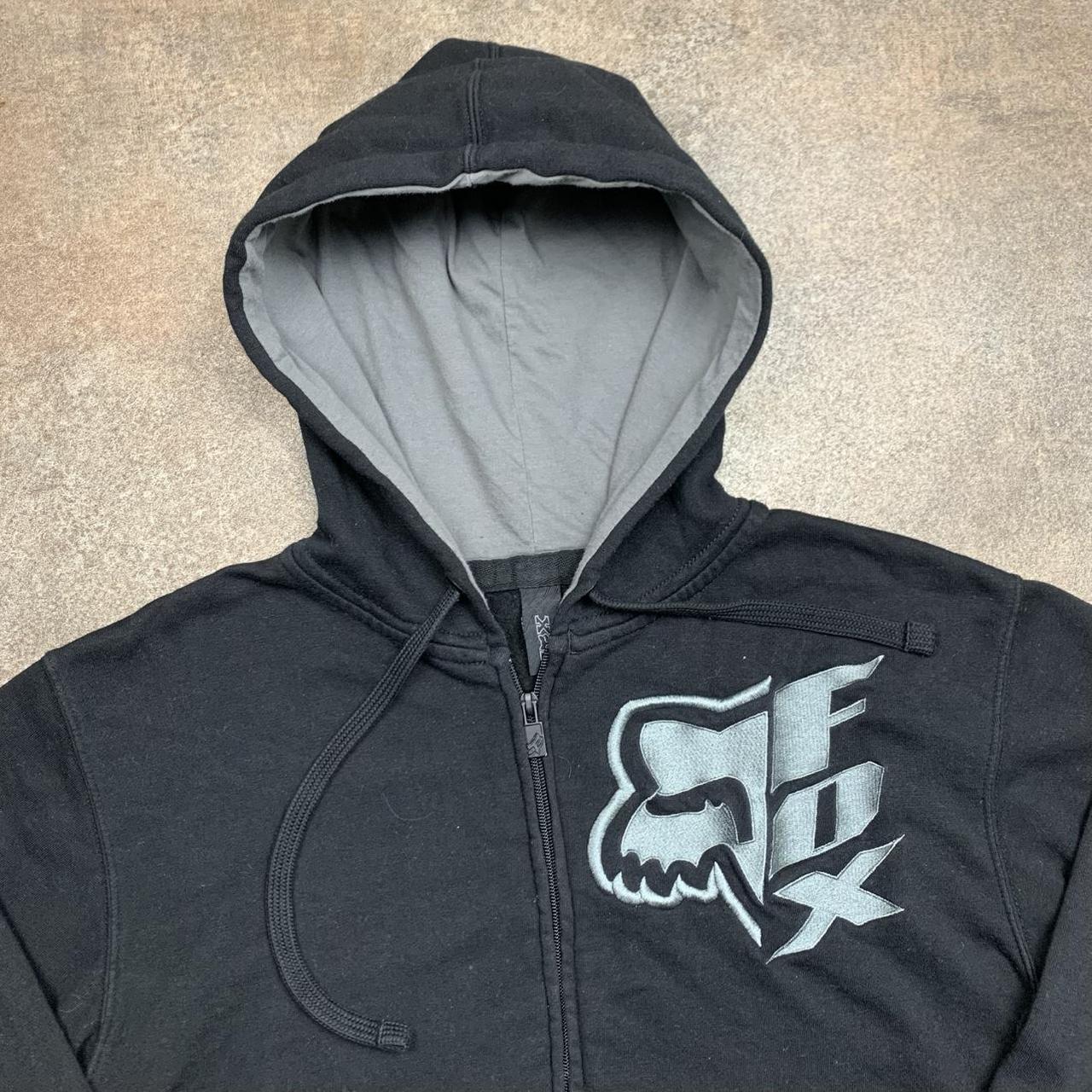 Fox Racing hoodie with a grey embroidered graphic on the front, a branded zip, coloured black all over & in excellent second hand condition with minimal wear.