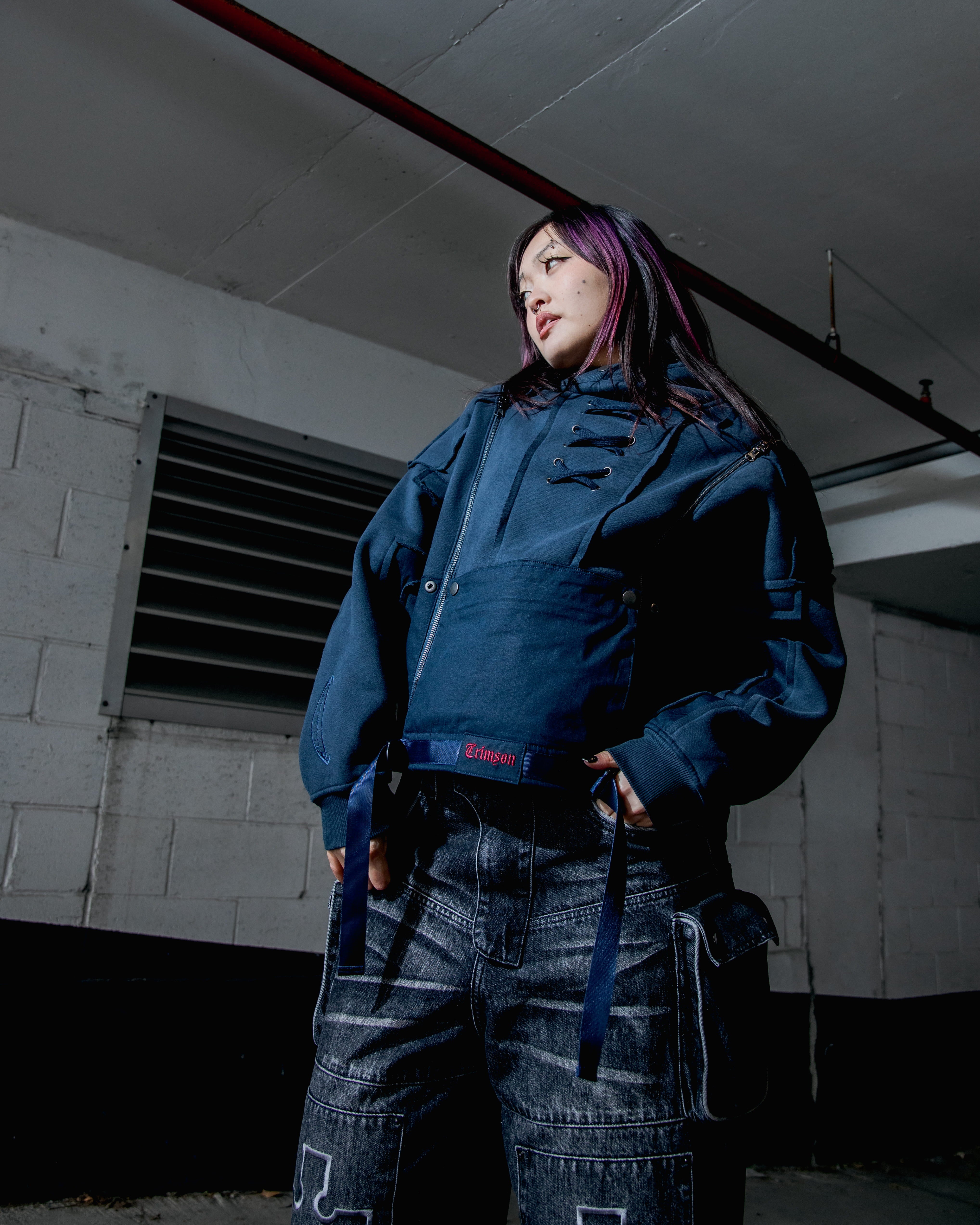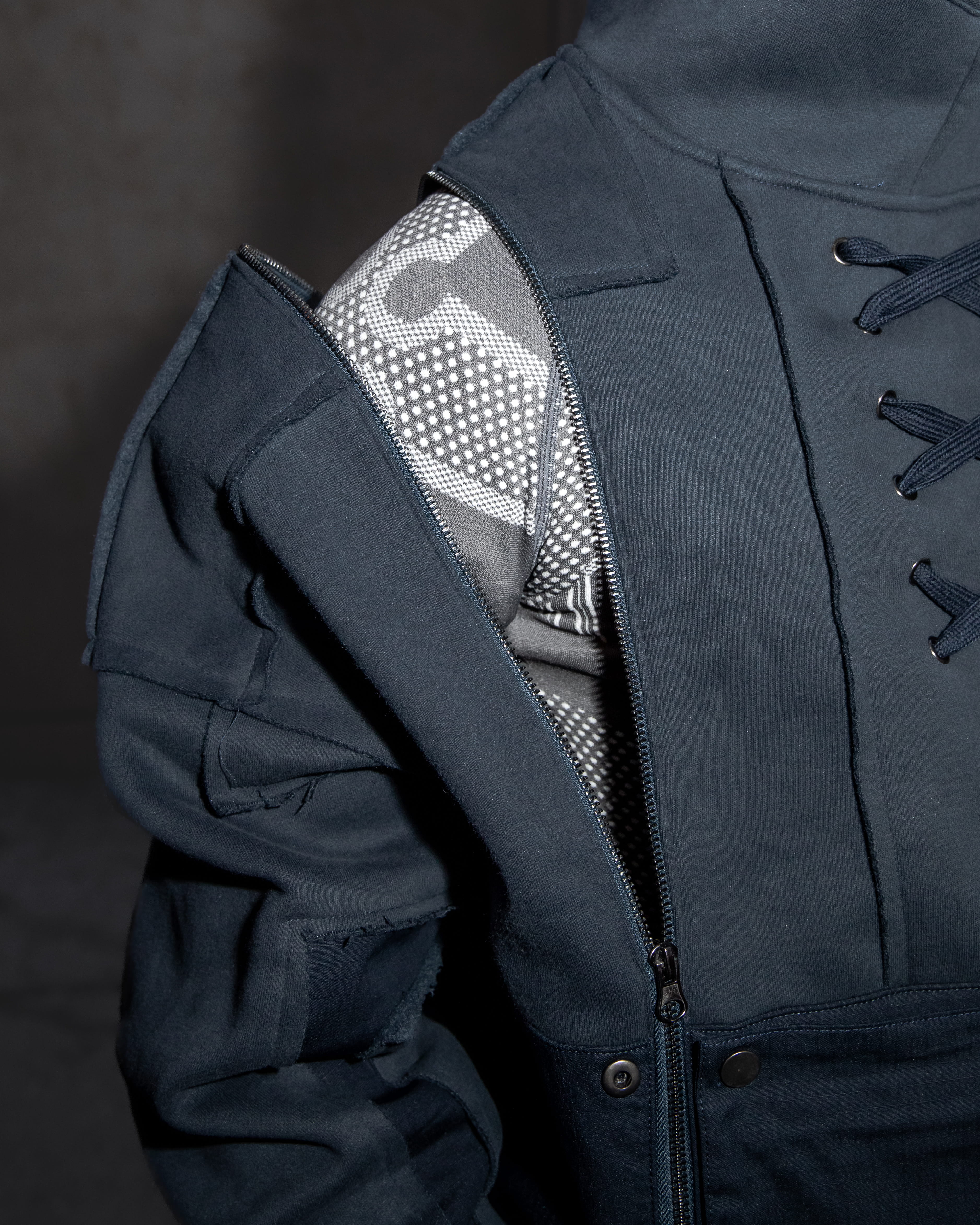 This hoodie is cut & sewn with mixed fabric textures (fleece + ripstop contrast) and raw-edged seams. Made from a 70% cotton / 30% polyester blend. Features a detachable face mask, chest lacing detail, and functional zippers on the hoodie and shoulders. Finished with a multi-layered front pocket, built-in belt, embroidery details, and a reflective print inside the kangaroo pocket.