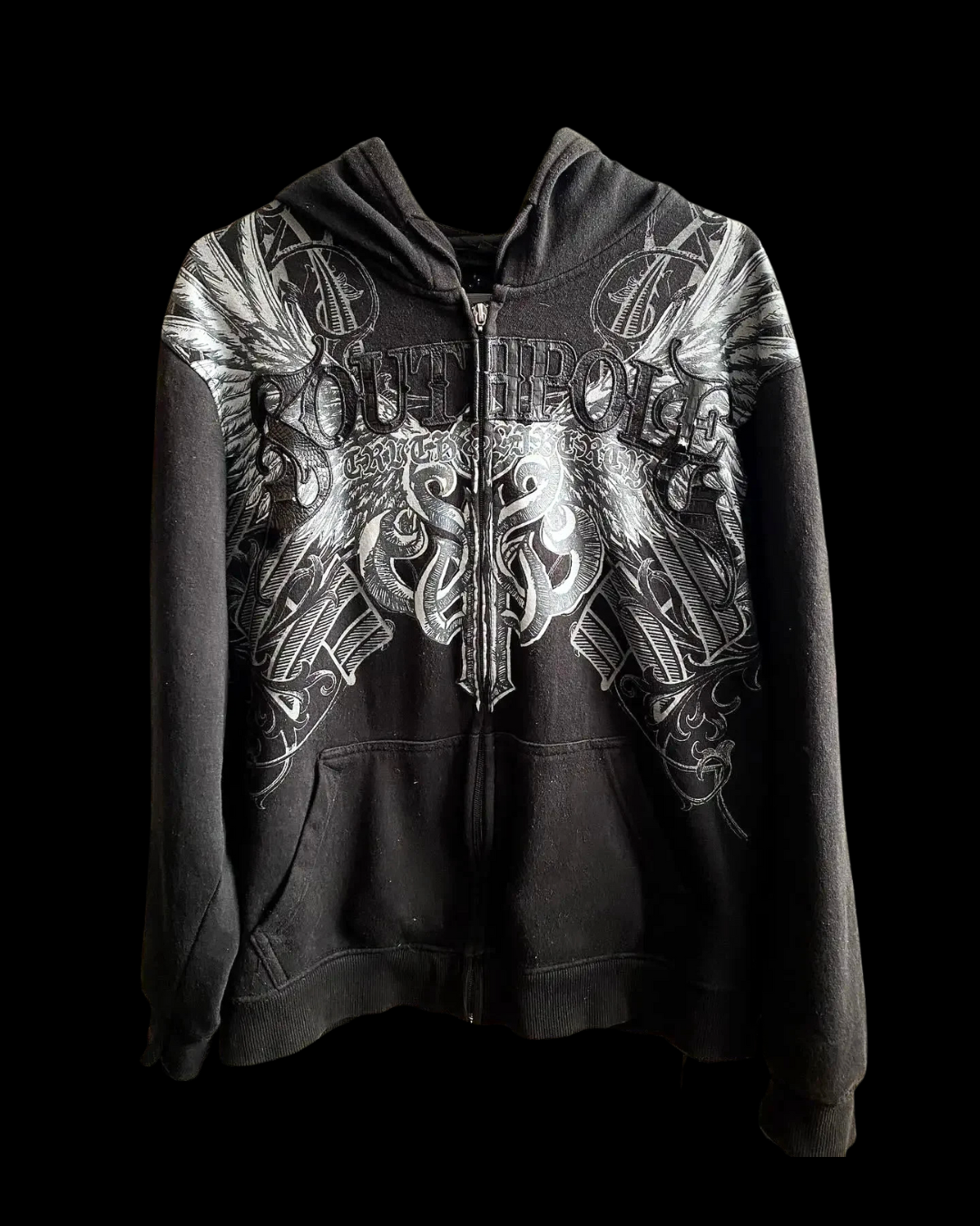 Black full-zip hoodie blasted with chrome-silver gothic graphics. Winged crest across the chest and shoulders, layered script, like a flyer pulled from a 2000s warehouse wall. Drawstring hood, kangaroo pockets, ribbed cuffs/hem, and a broken-in, heavyweight feel for daily wear. Cotton blend, true to size, and ready to ship.