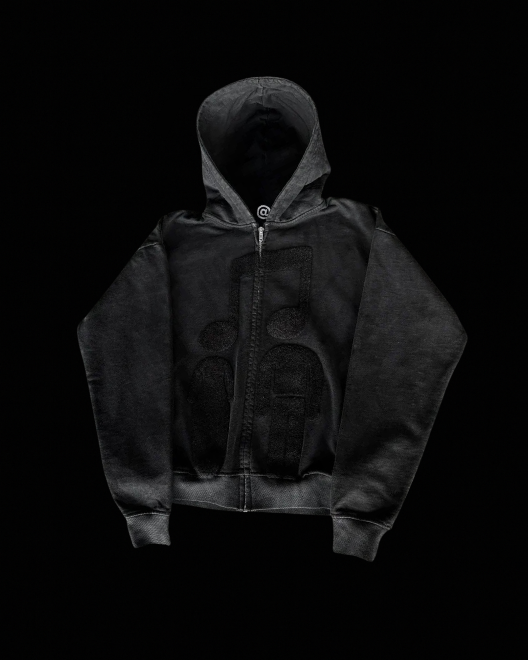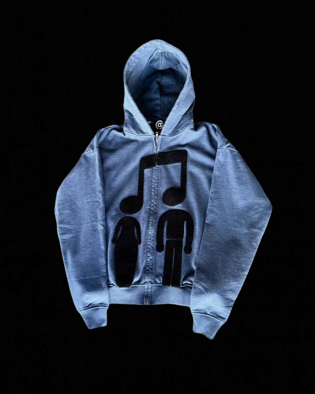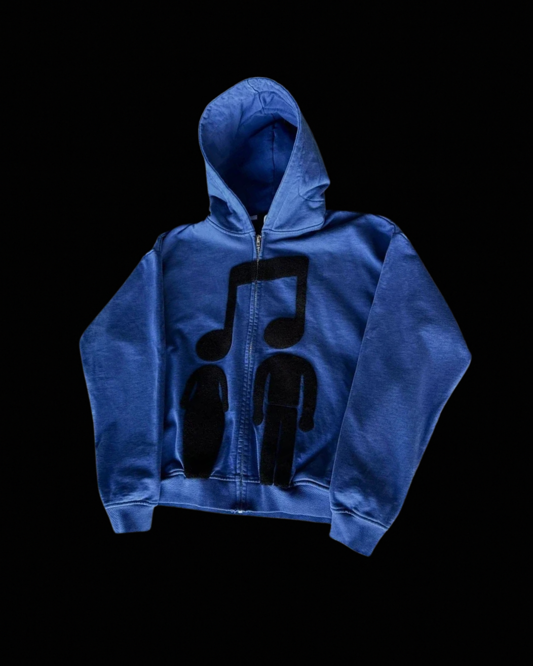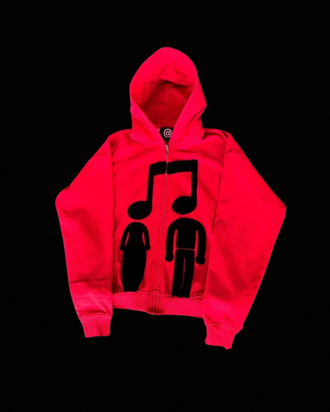 Pink full-zip hoodie with a bold black front graphic—oversized music notes above figure icons. Mid-weight, relaxed fit, split kangaroo pockets, and ribbed cuffs/hem. Cotton blend, true to size, and ready to ship.