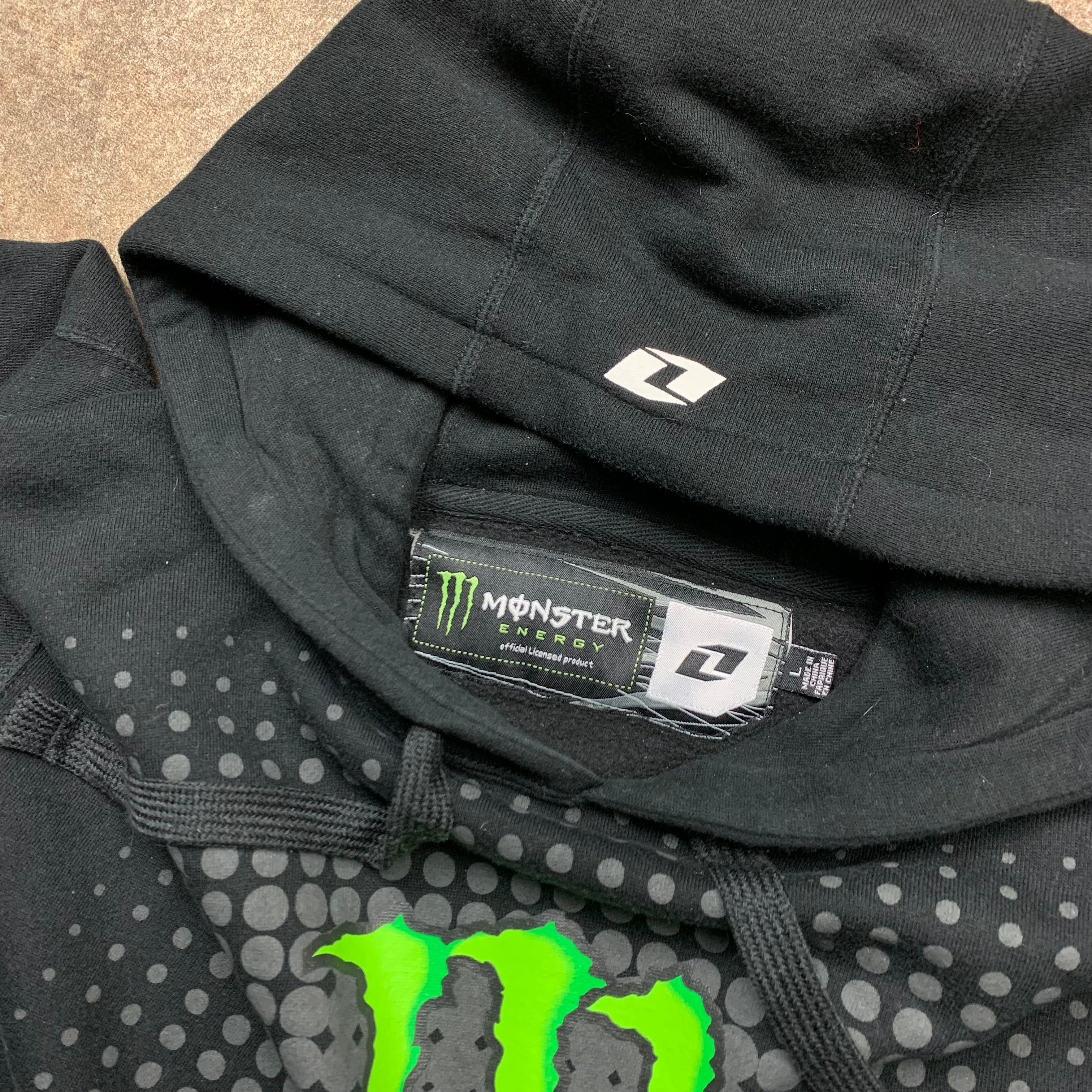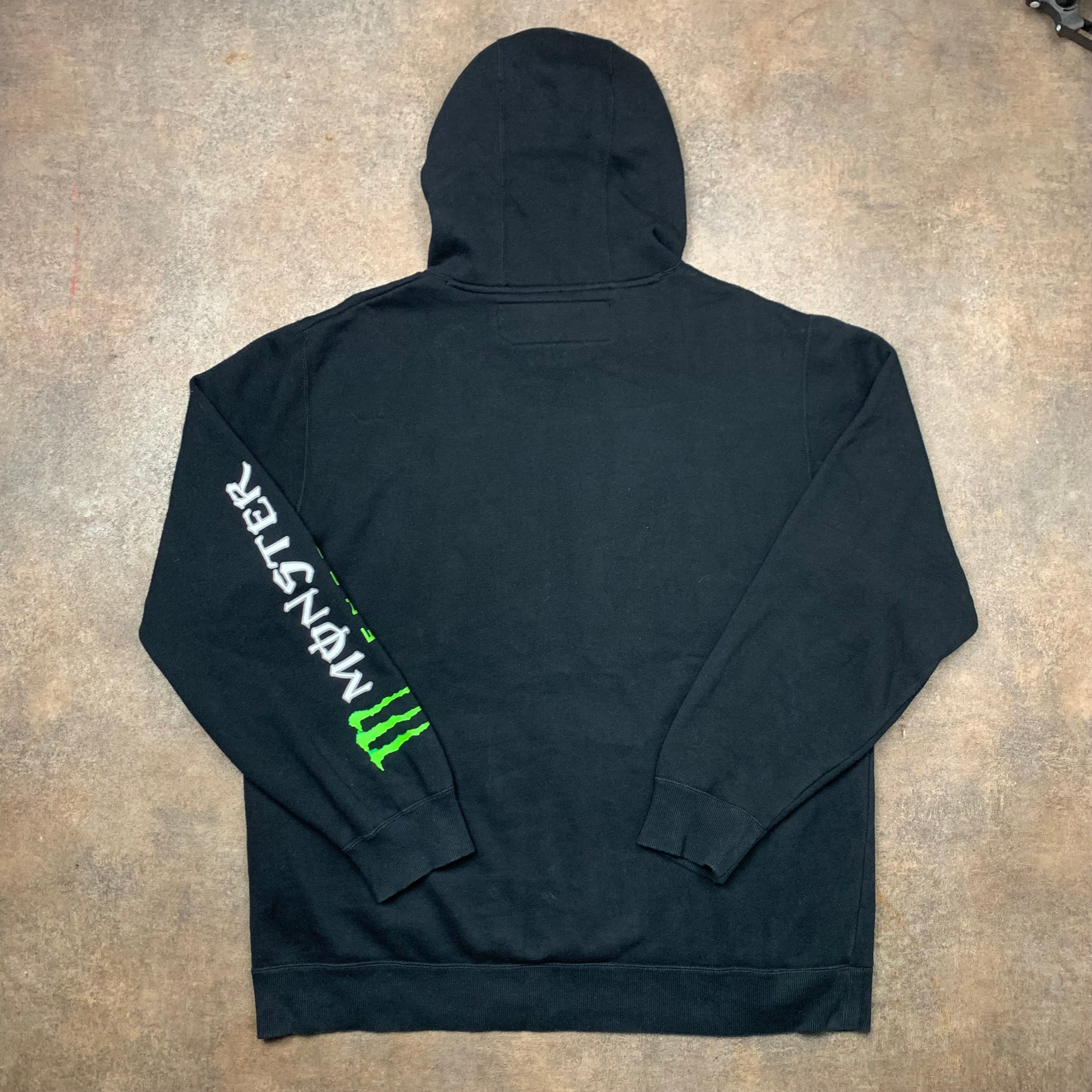 Vintage One x Monster hoodie with printed monster graphics on the front and the left sleeve, small one logo on the hood, coloured black all over and in excellent second hand condition with minimal wear.