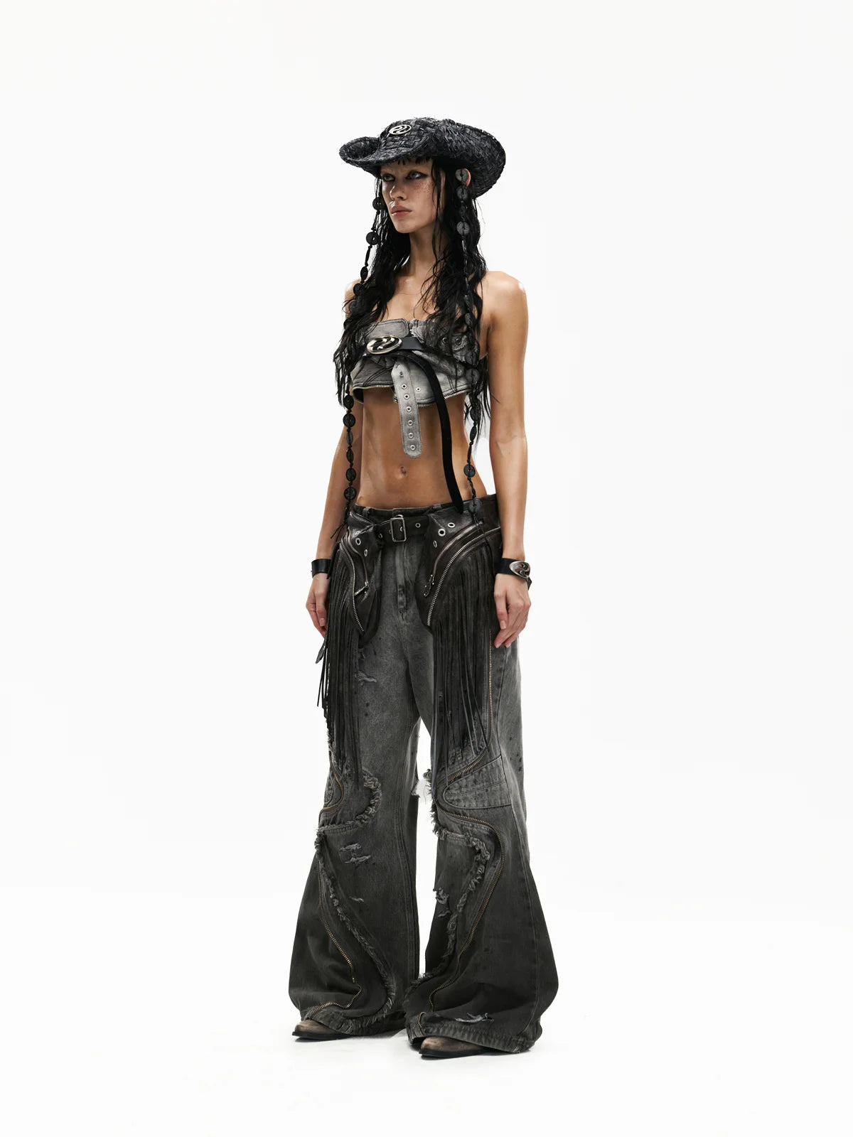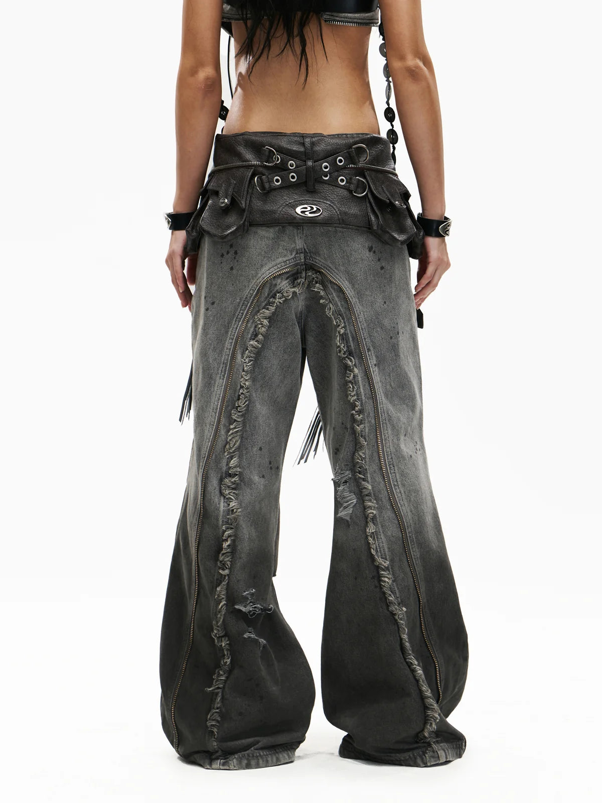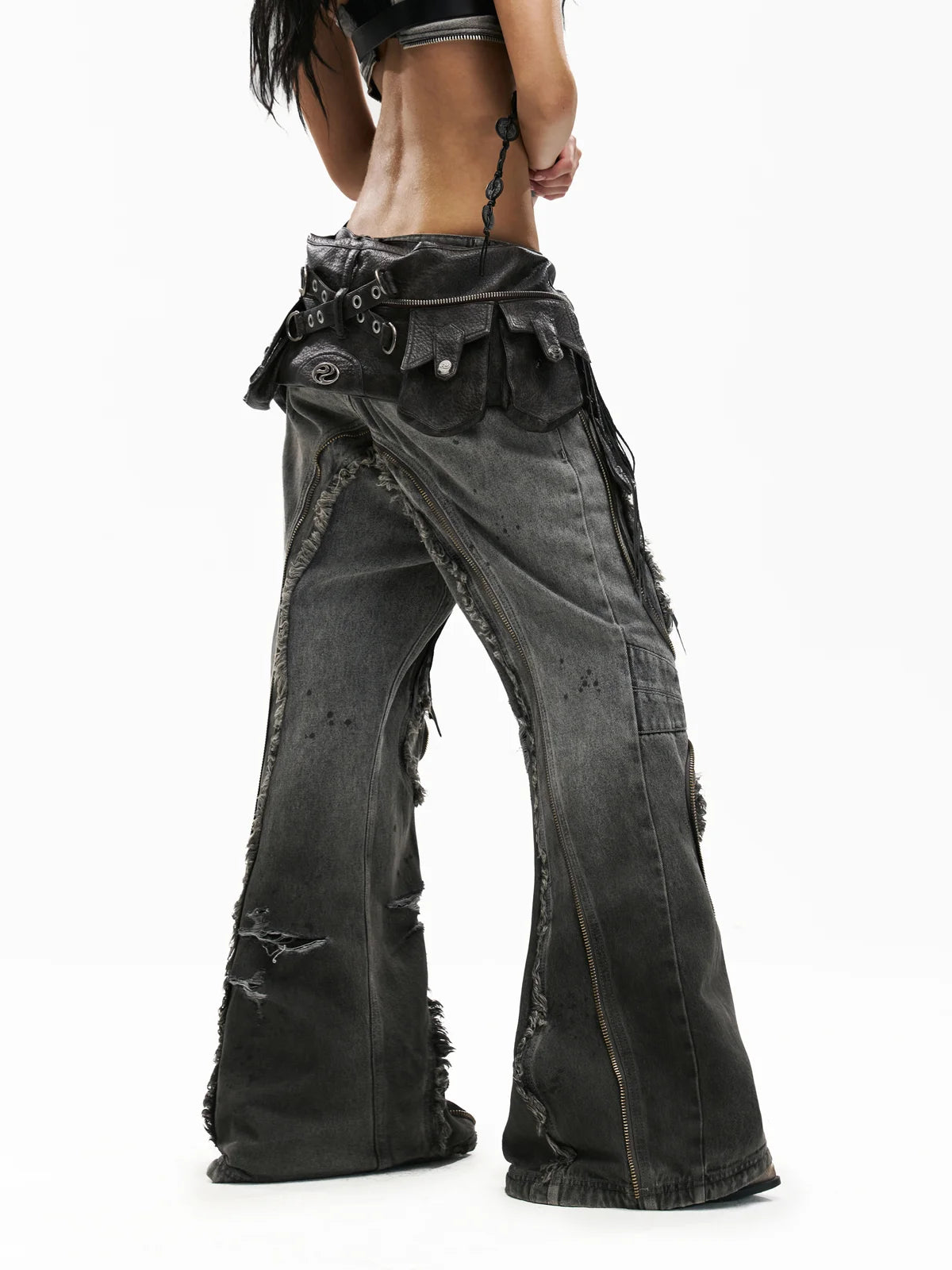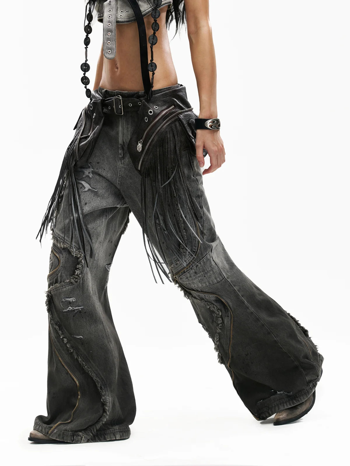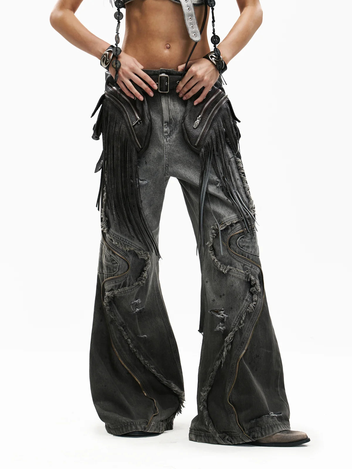 Personsoul Fringed Belt Raw Edge Jeans