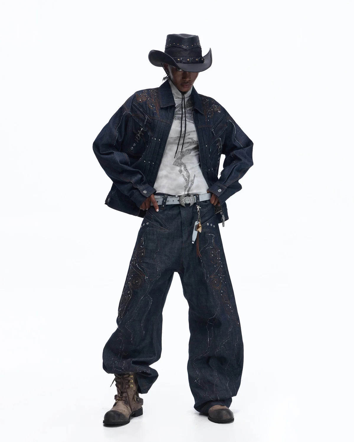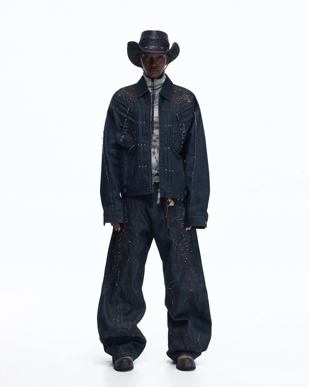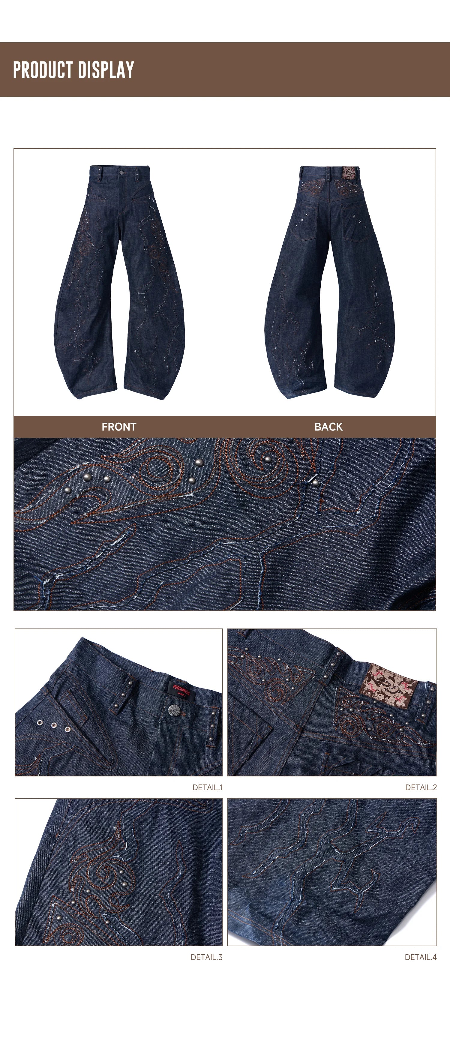 Personsoul Patchwork-Embroidered Raw Denim Curved Pants