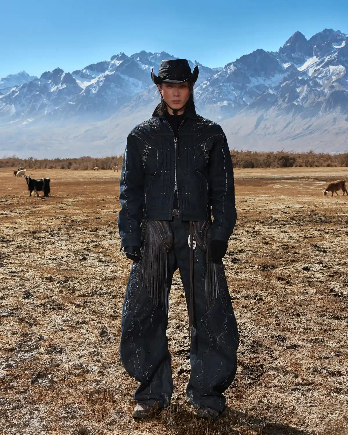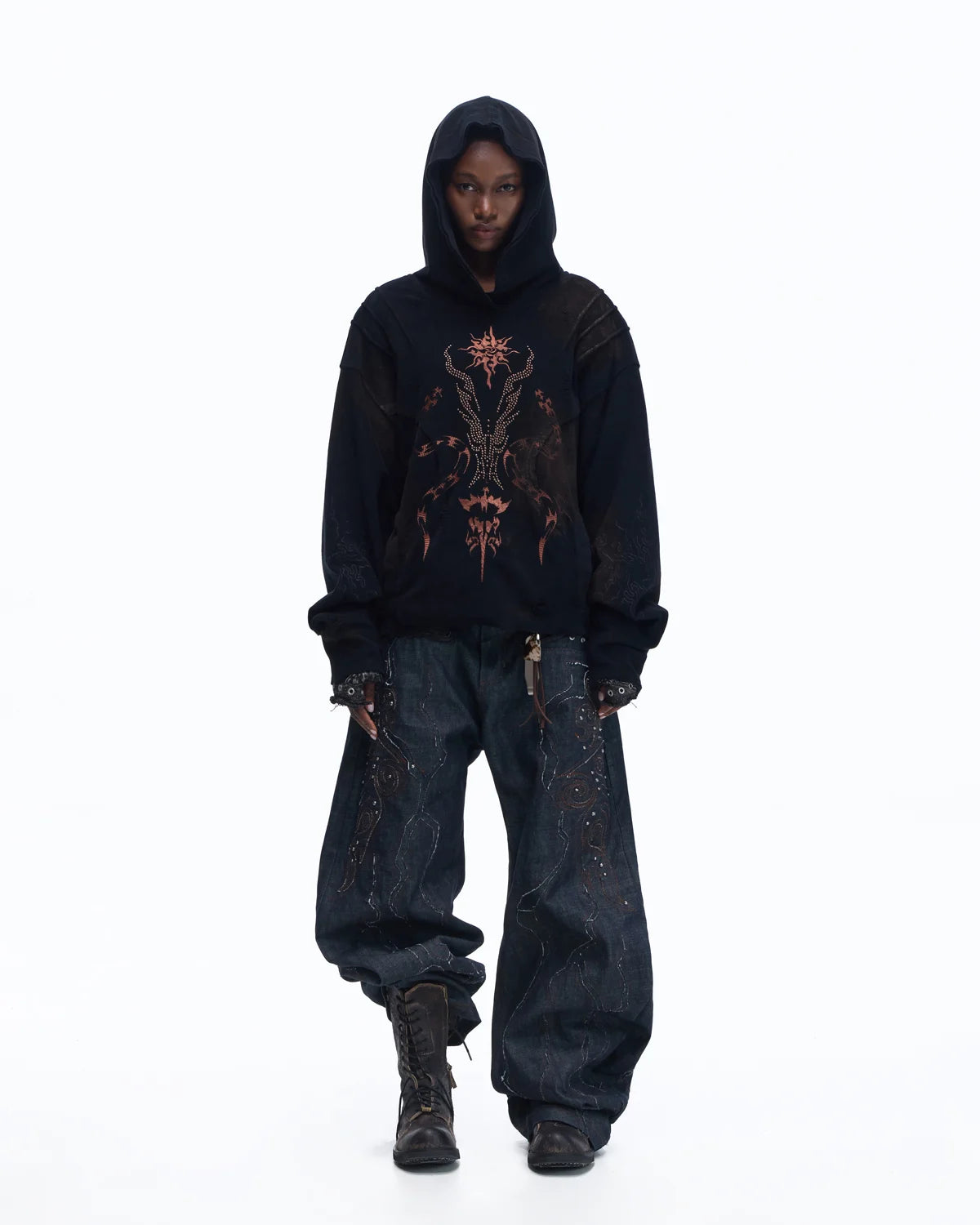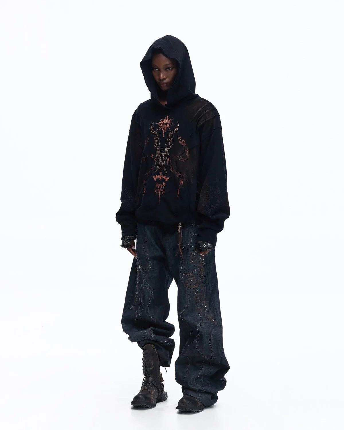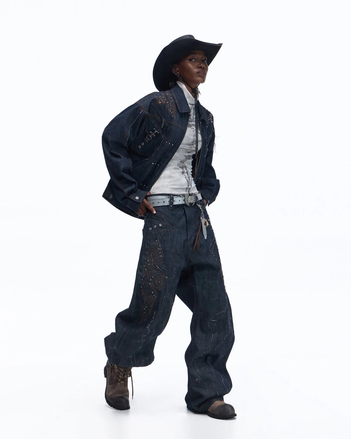 Personsoul Patchwork-Embroidered Raw Denim Curved Pants