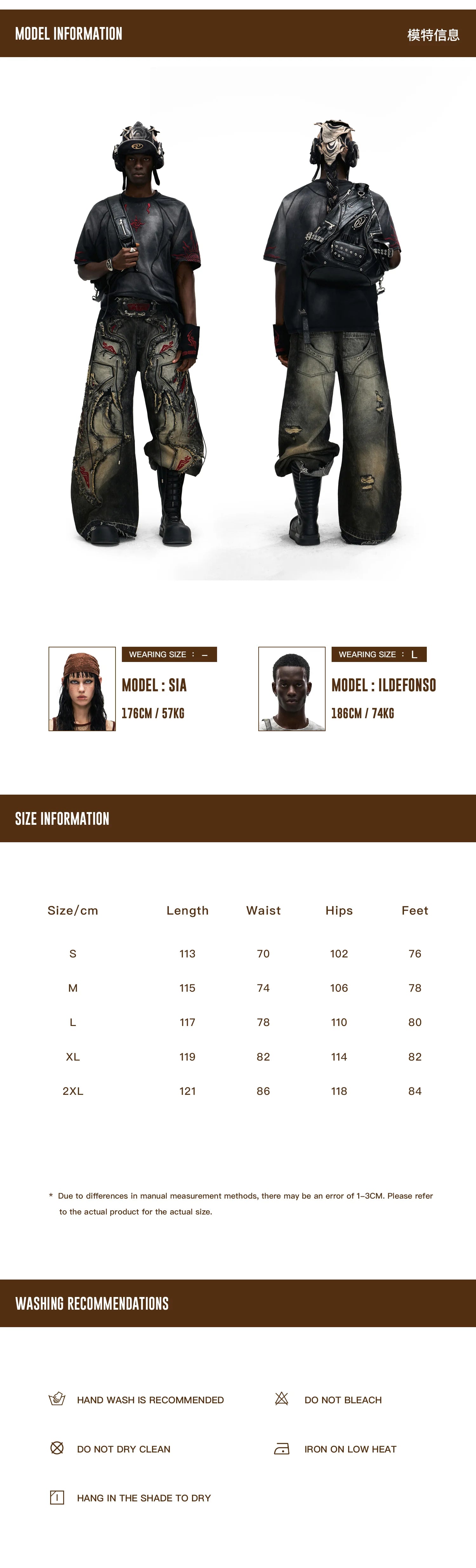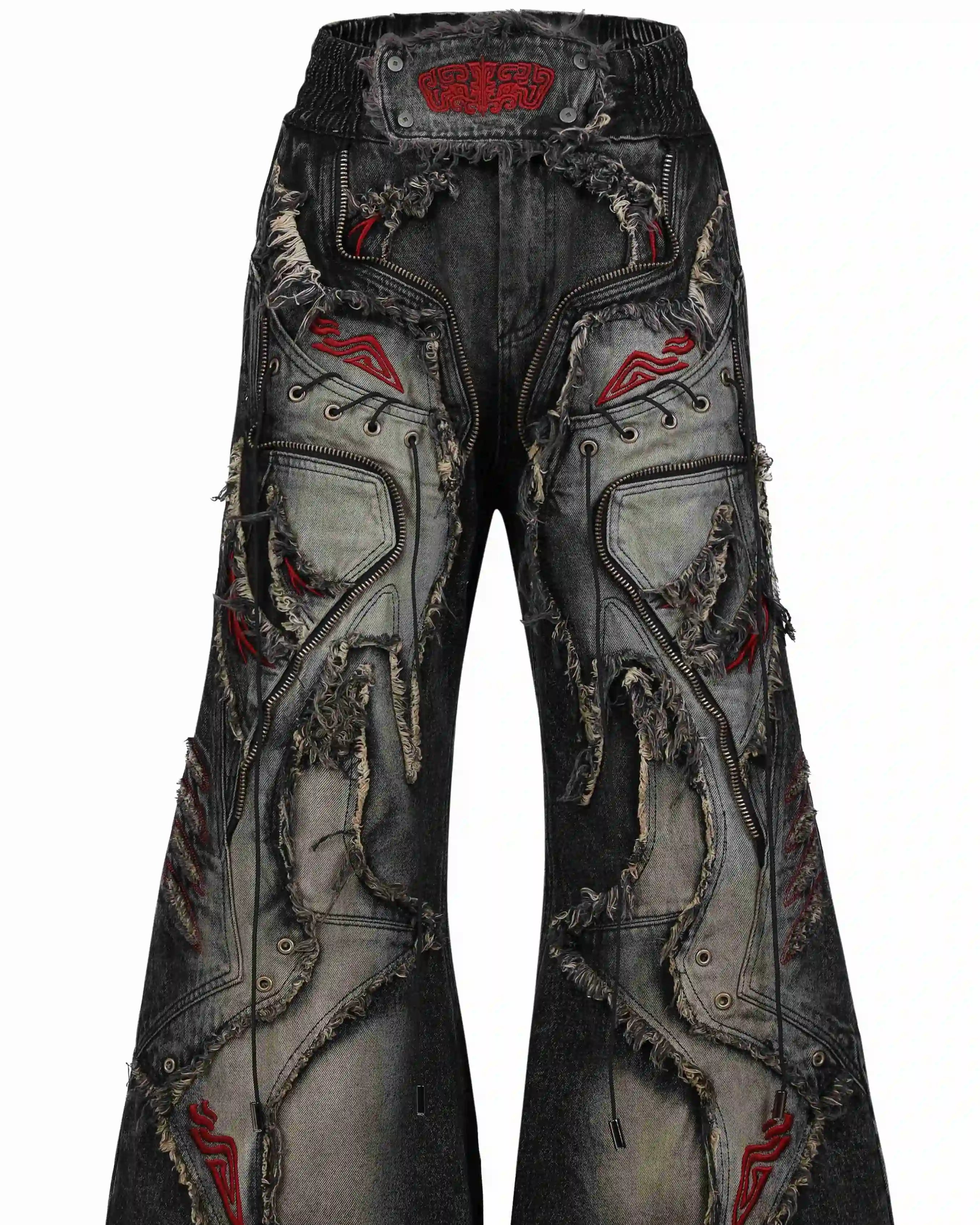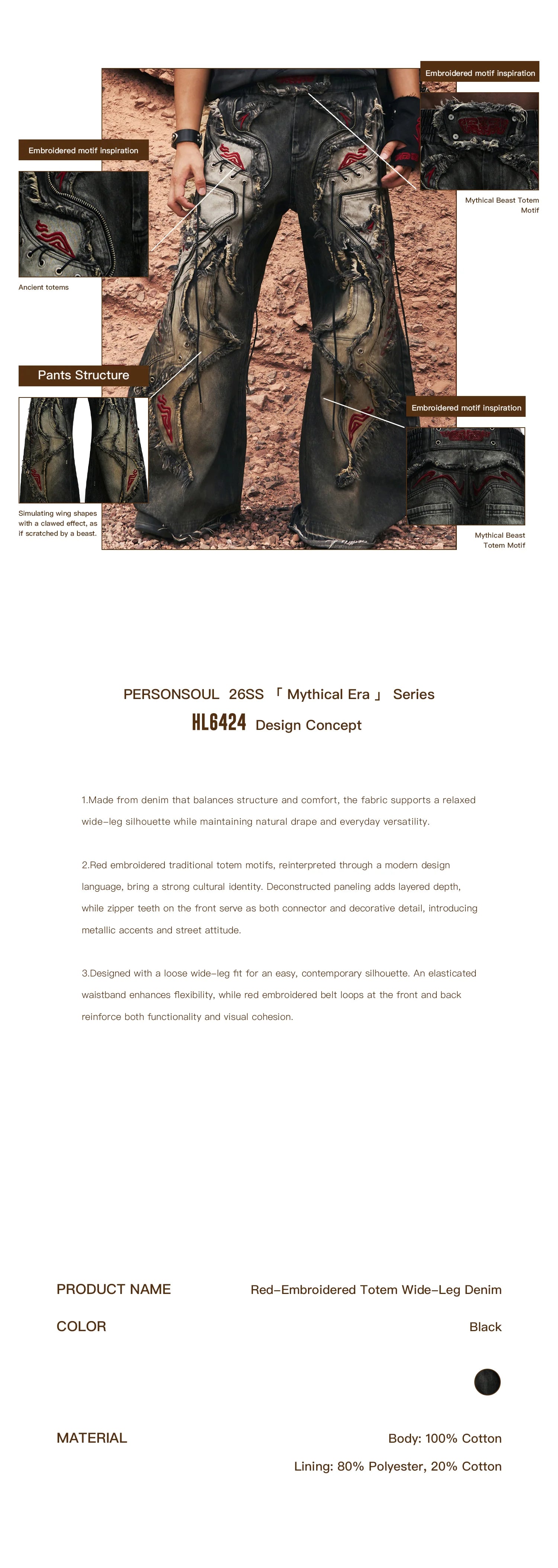 Personsoul Red-Embroidered Totem Wide-Leg Denim Jeans