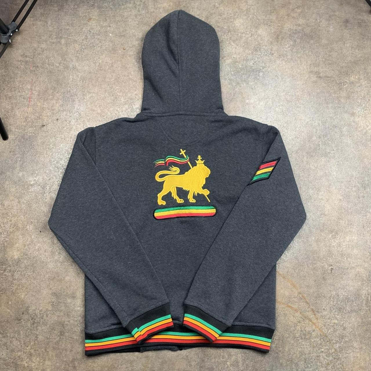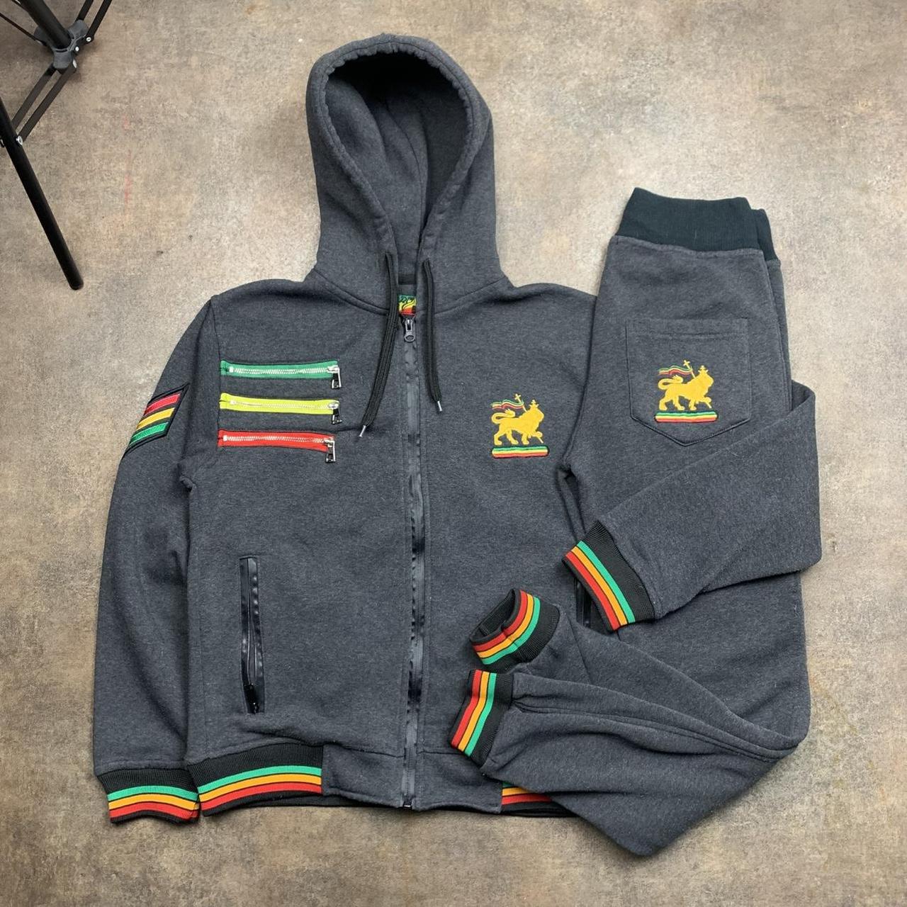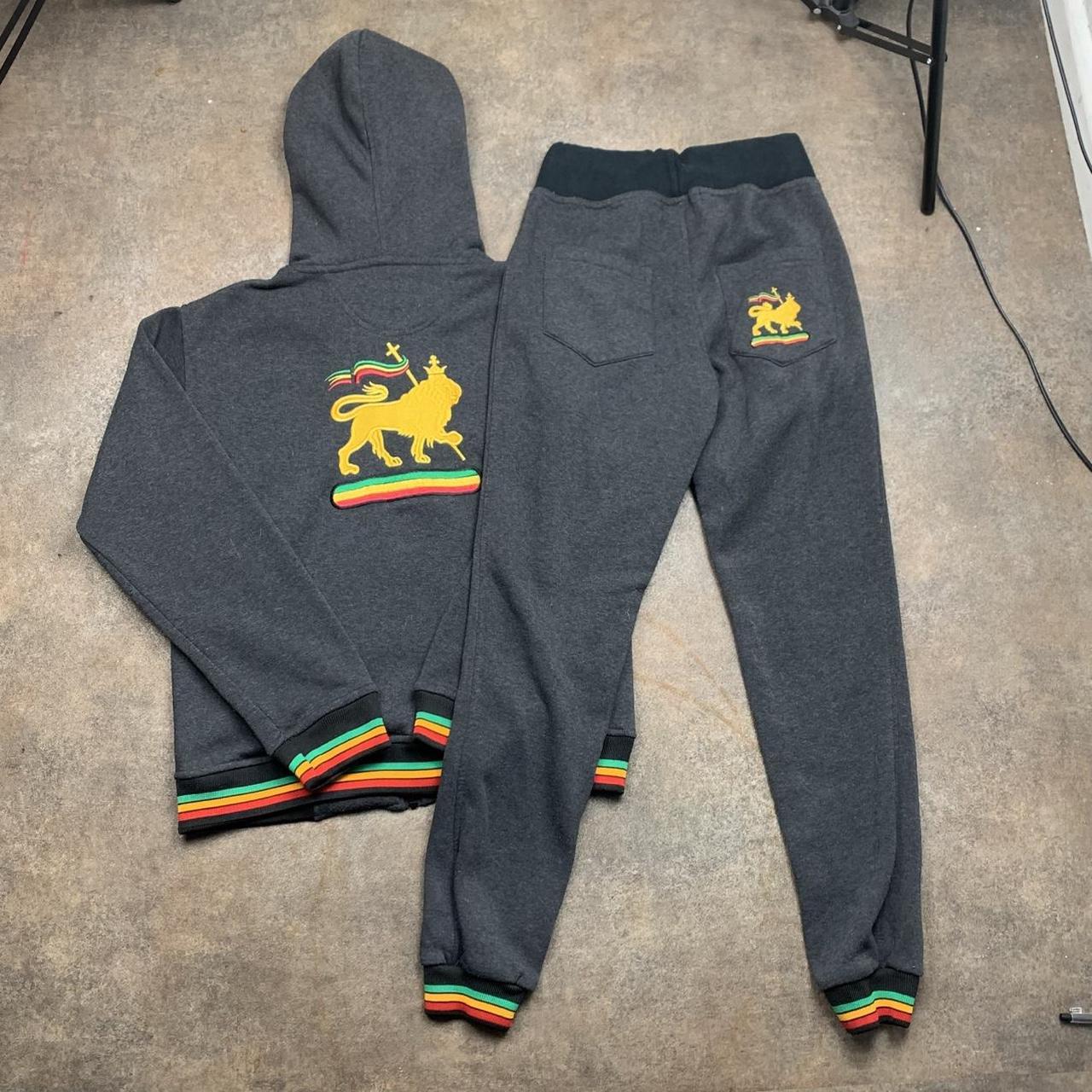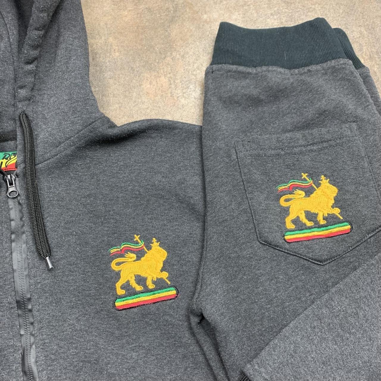Raw Blue tracksuit perfect for the summer & at a good price with embroidered lion graphics, rasta coloured detailing & in excellent second hand condition with joggers drawstrings missing.