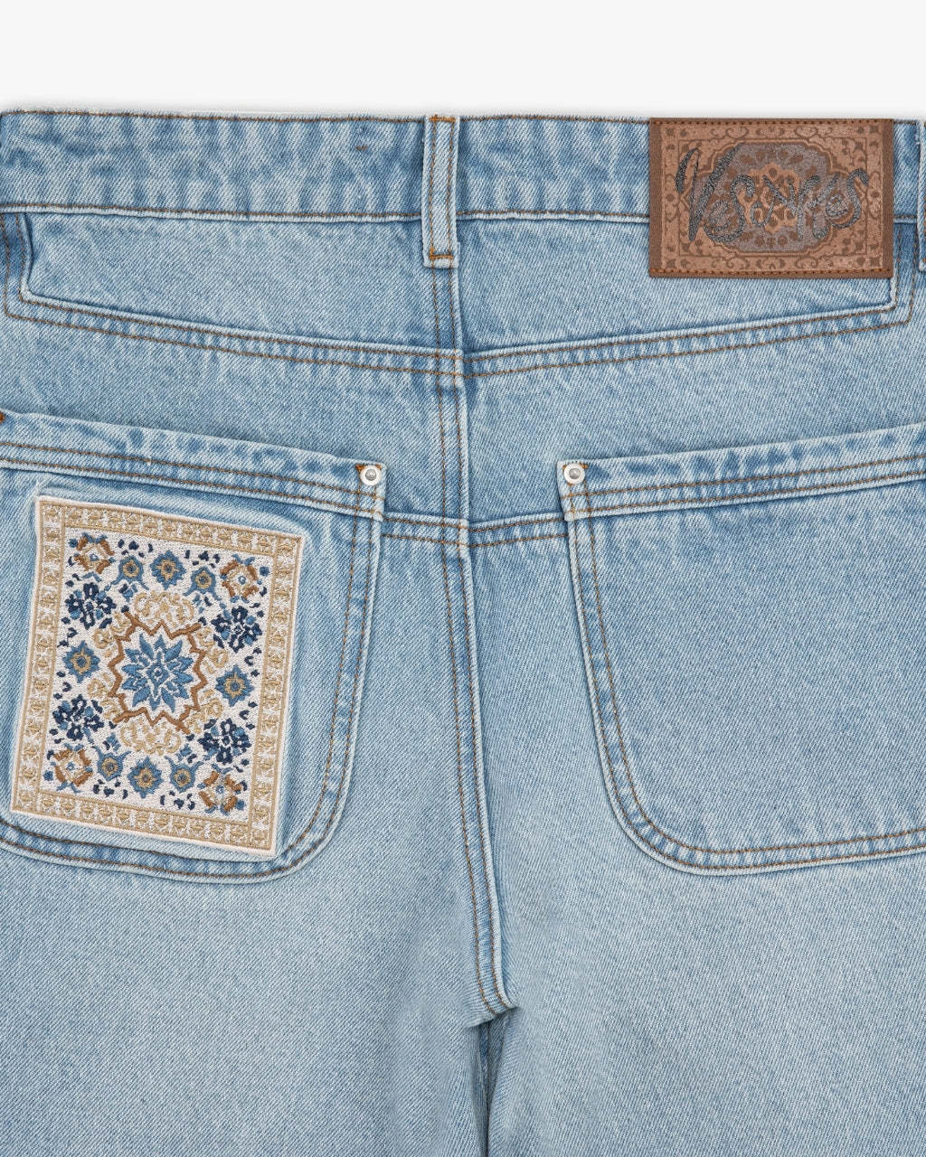 Each patch features a distinct motif in layered blues and creams, giving quiet depth to the silhouette. Signed off with a custom leather tab featuring sketch-style Vescartes branding.