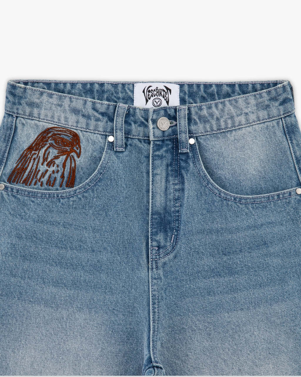Cut in a light blue wash and elevated with intricate embroidery inspired by Arabic falconry traditions. A front-pocket eagle adds a subtle touch, contrasted by a large hero embroidery on the back — a falconer and his bird rendered across and beyond the rear pocket. Finished with a premium black leather Vescartes patch.