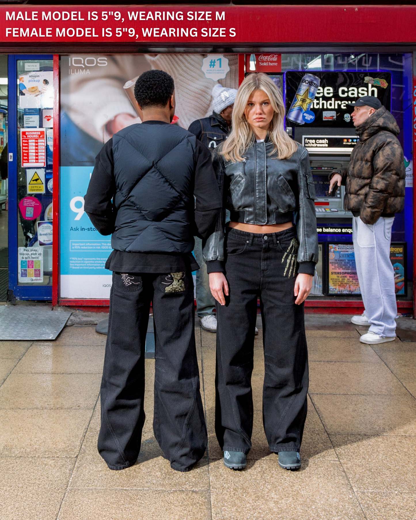 Jet-black denim subtly faded for a worn-in look. The front left pocket carries an intricate skeleton hand embroidery. The back features dual pocket embroidery inspired by Van Gogh and spells ‘Vescartes’ in the drifting smoke. Finished with custom front and back panel construction and our signature metal hardware.