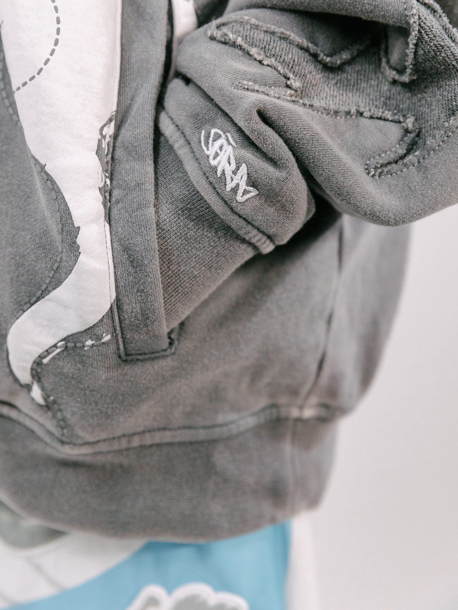 Heavyweight hoodie constructed from washed 100% cotton French terry, worn in and softened like it’s already lived a life. Layered graphics move across the piece through puff-printed clouds and printed stitching lines, creating depth that shifts with wear.